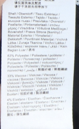 - Material Breakdown: 63% Polyester 33% Viscose 4% Elastane