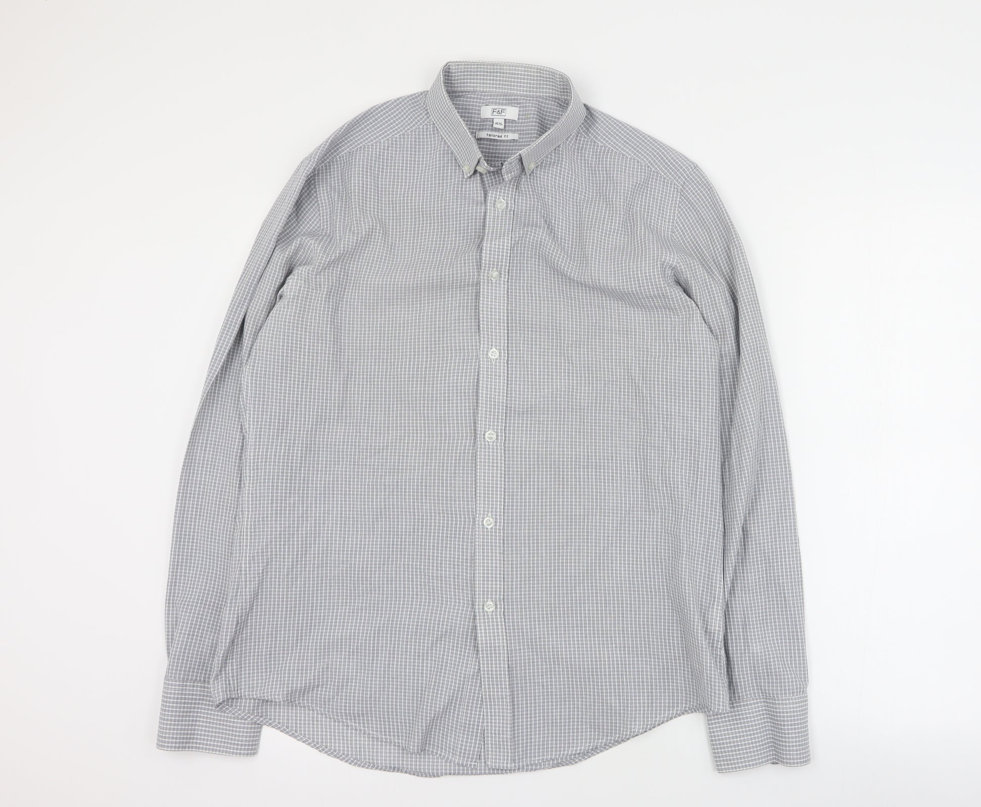 F&F Mens Grey Plaid Polyester Button-Up Size 15.5 Collared Button