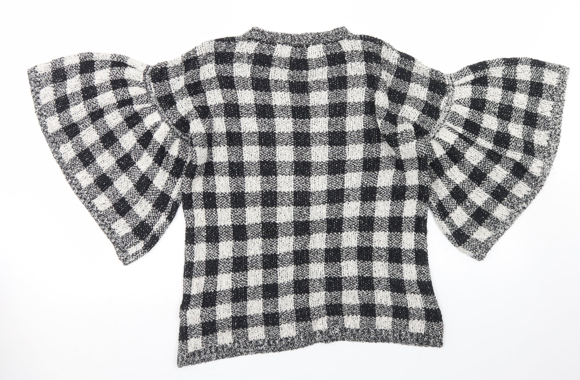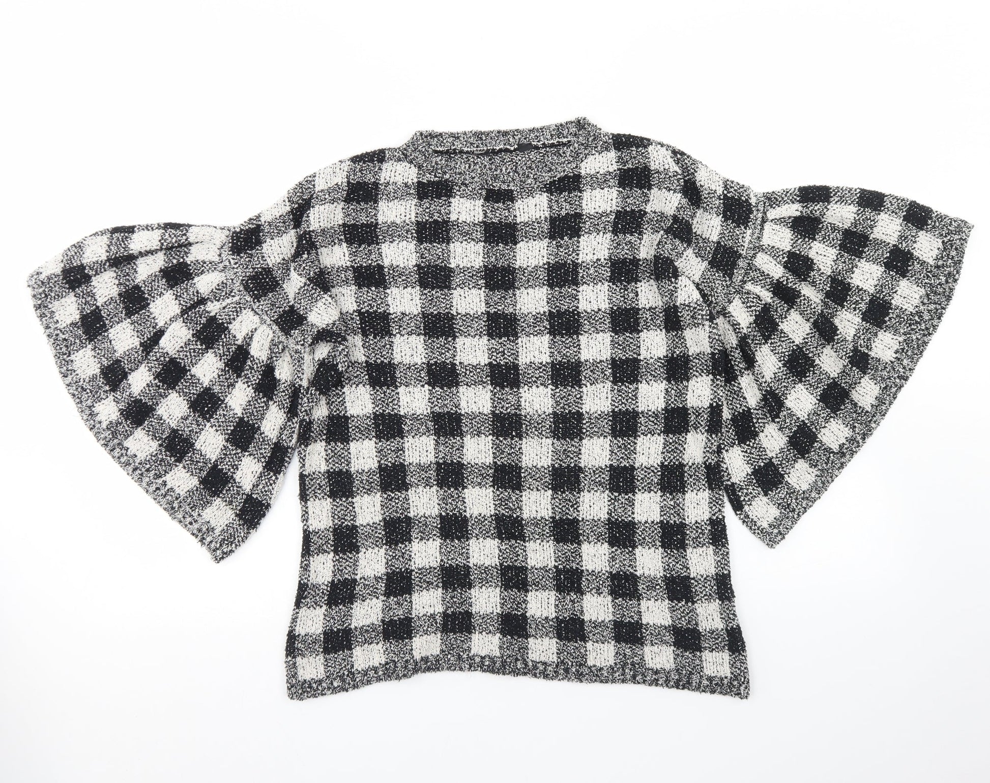 F&F Womens Black Crew Neck Check Cotton Pullover Jumper Size 6 - Flare Sleeve