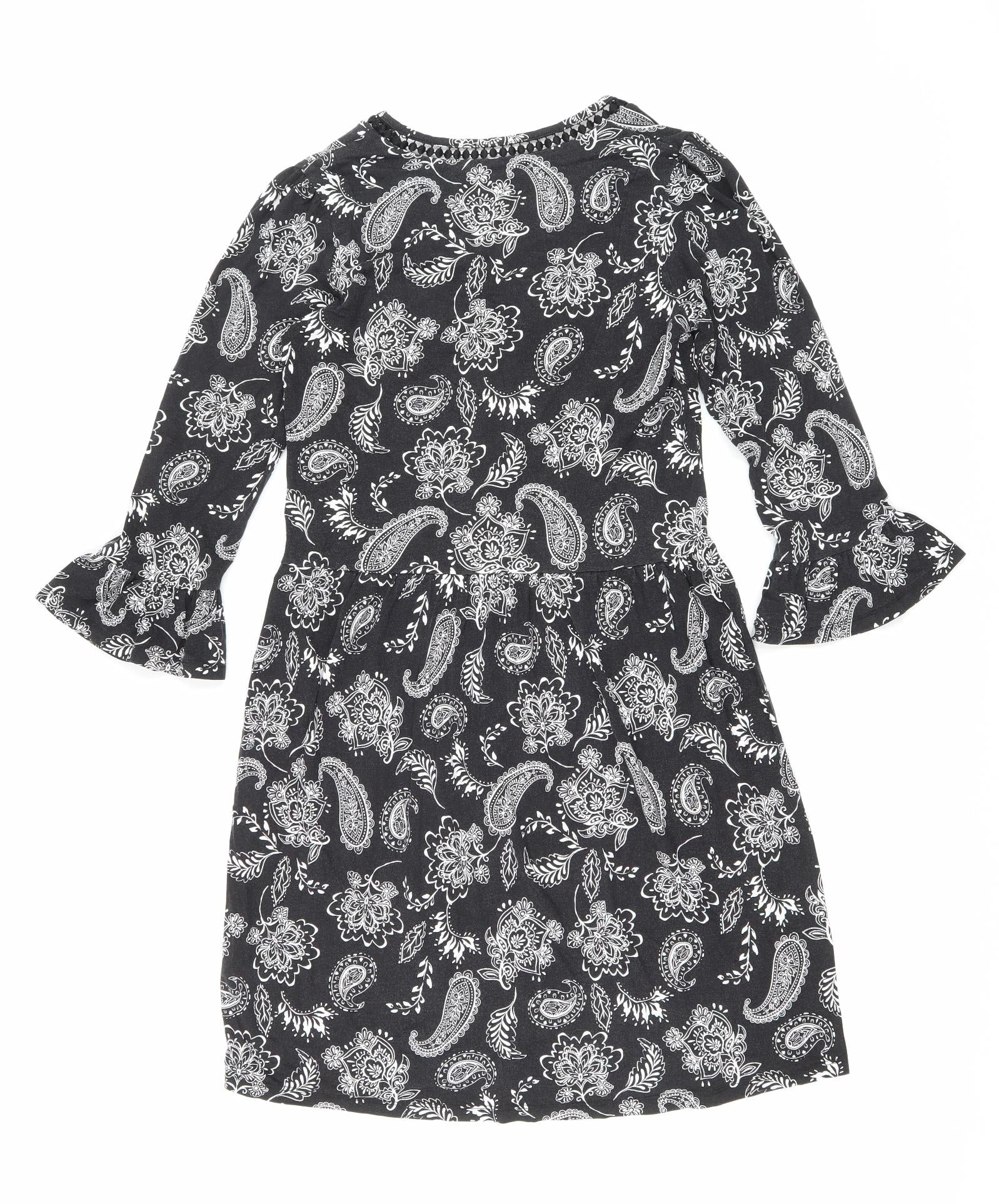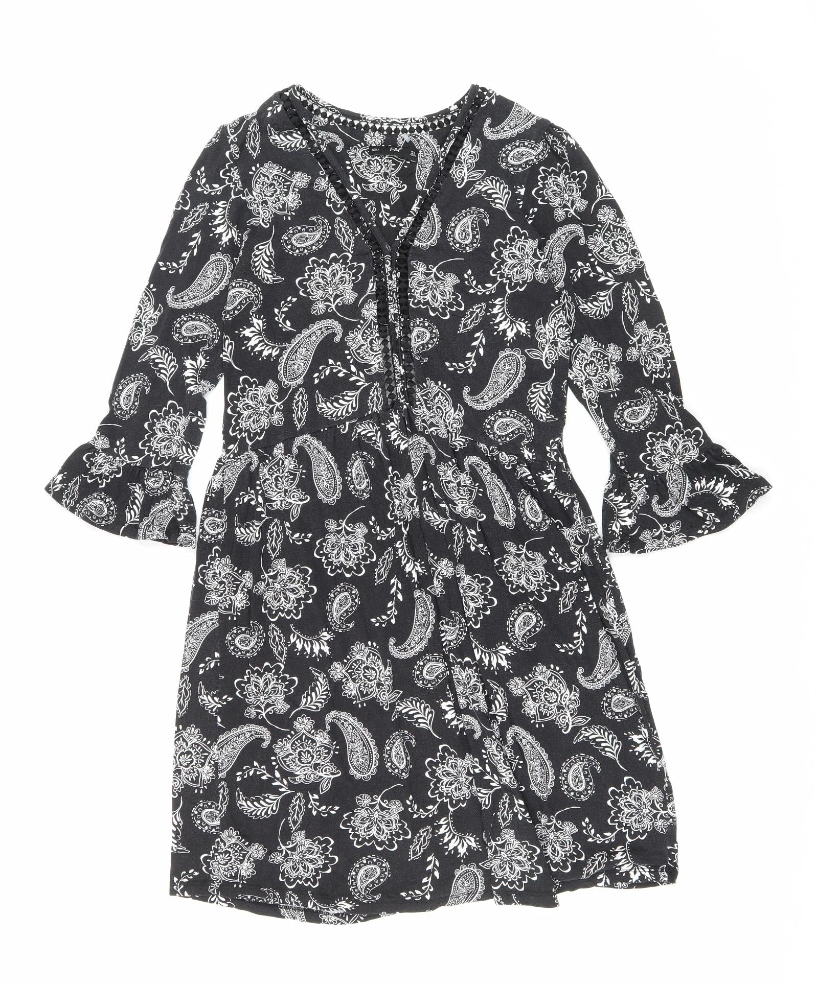 F&F Womens Black Floral Viscose Fit & Flare Size 6 V-Neck Pullover - Lace trim