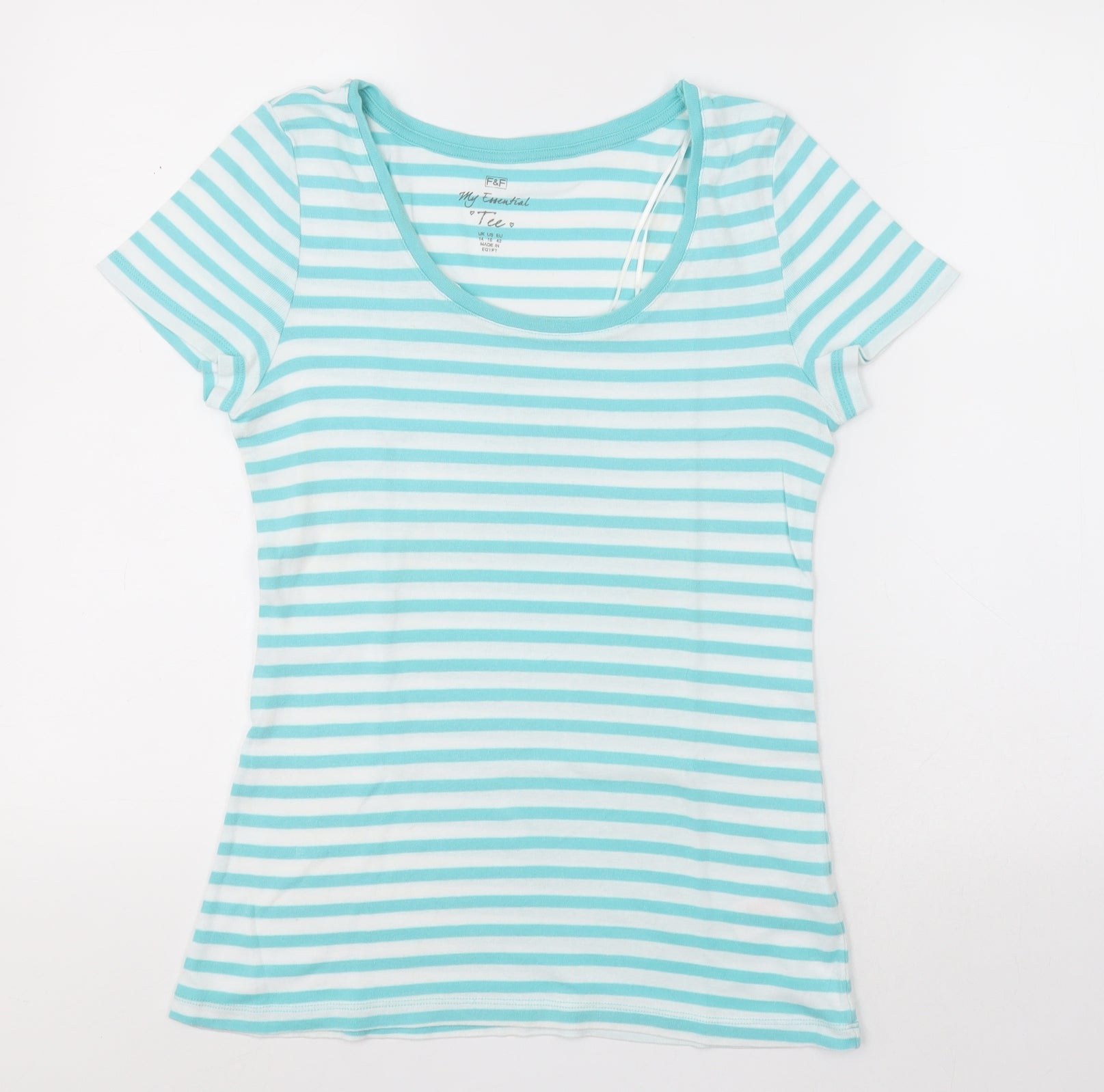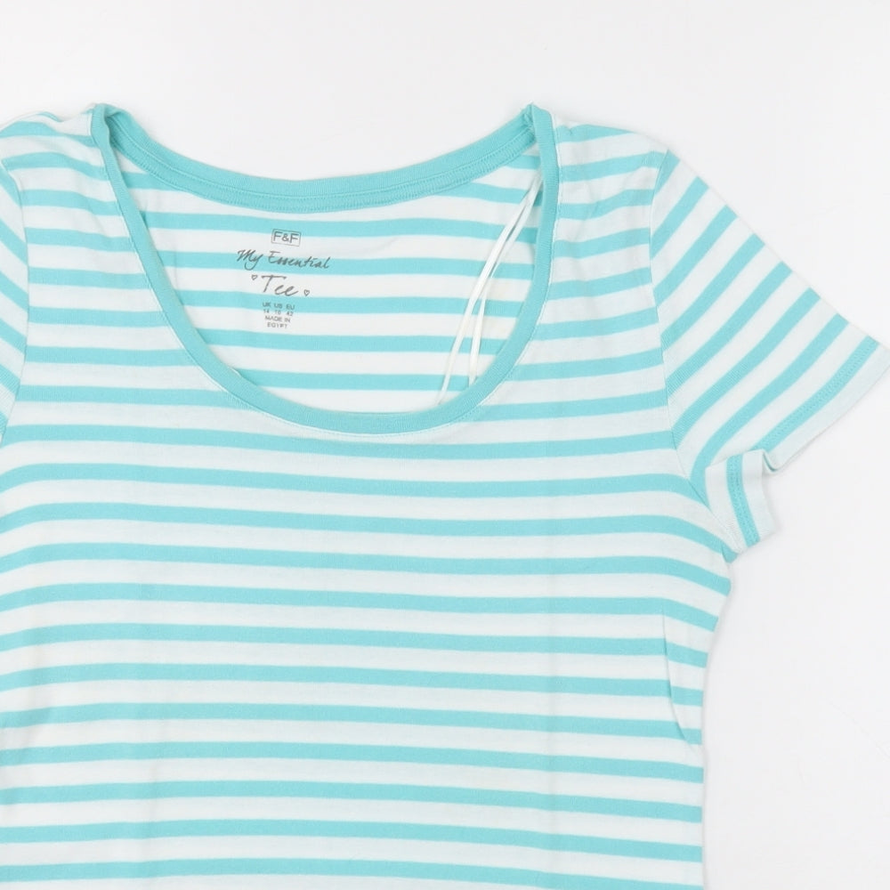F&F Womens Blue Striped Cotton Basic T-Shirt Size 14 Scoop Neck