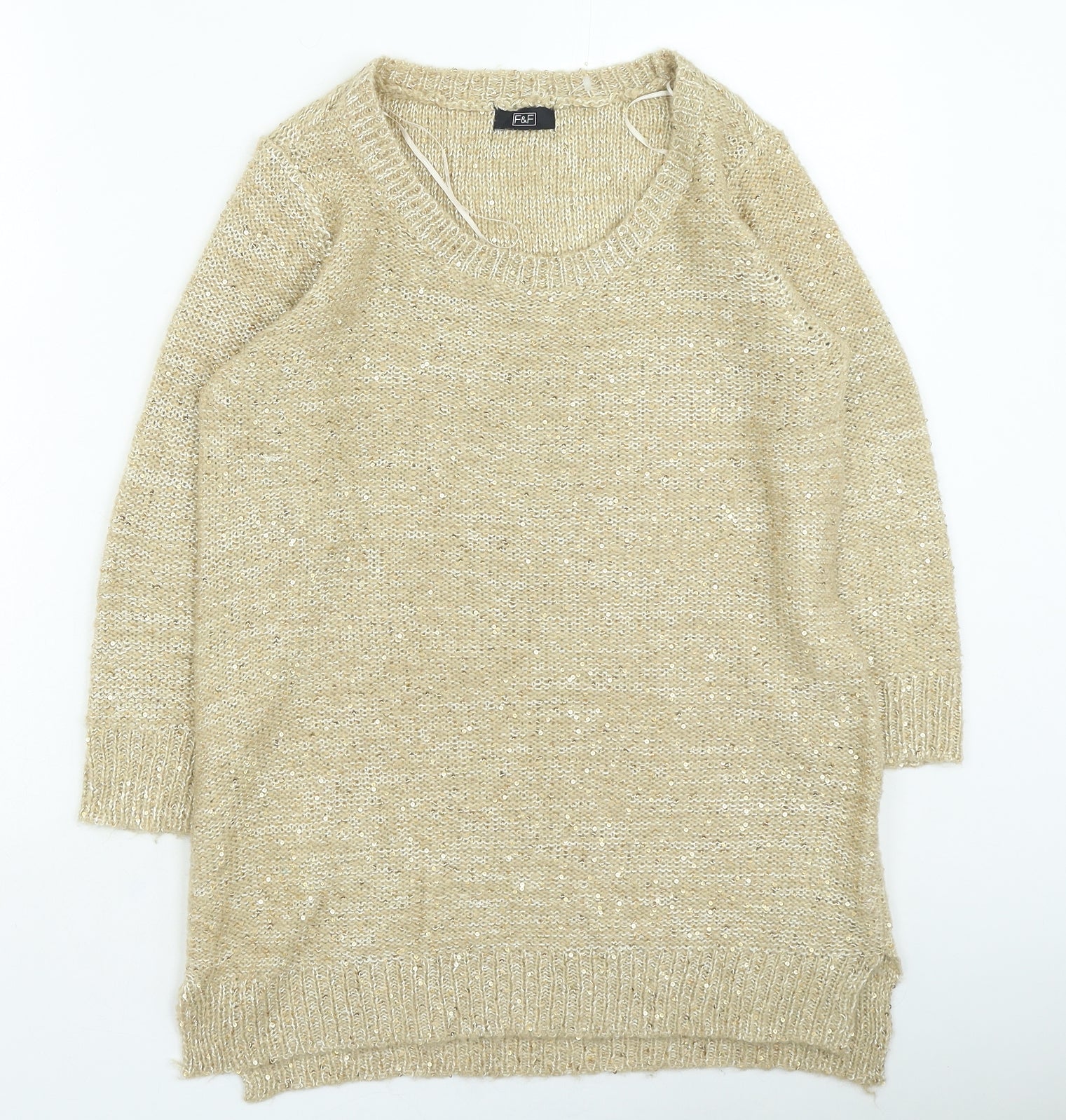 F&F Womens Gold Round Neck Polyester Pullover Jumper Size 14