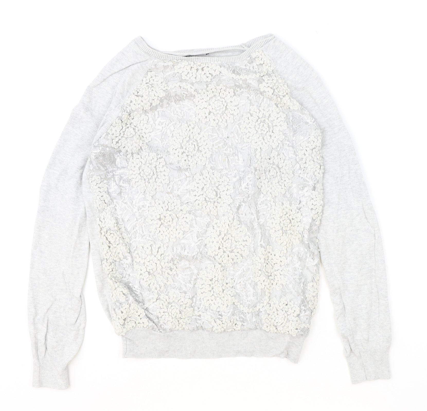 F&F Womens Grey Boat Neck Floral Cotton Pullover Jumper Size 12 - Lace Detail