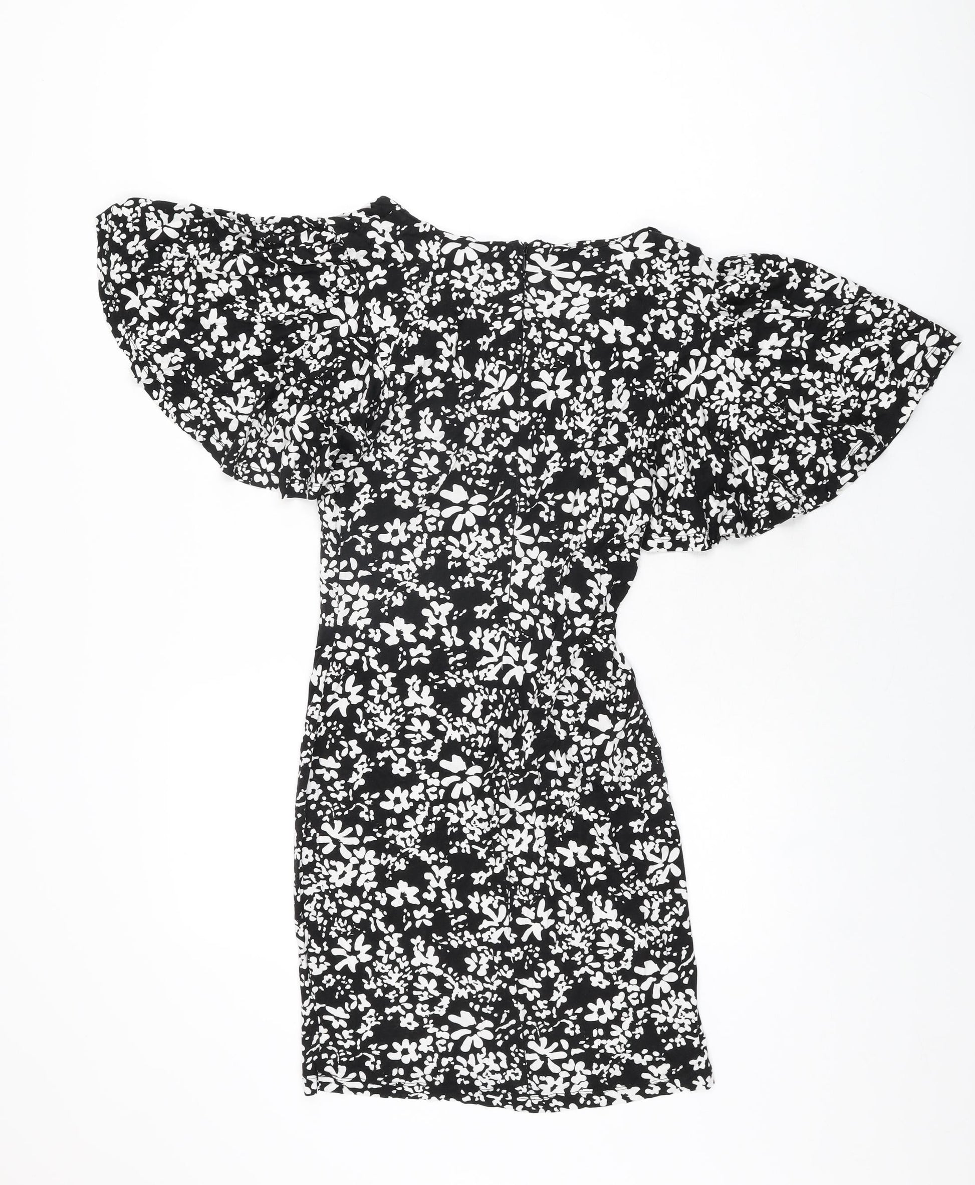 French Connection Womens Black Floral Viscose Mini Size 8 V-Neck Zip
