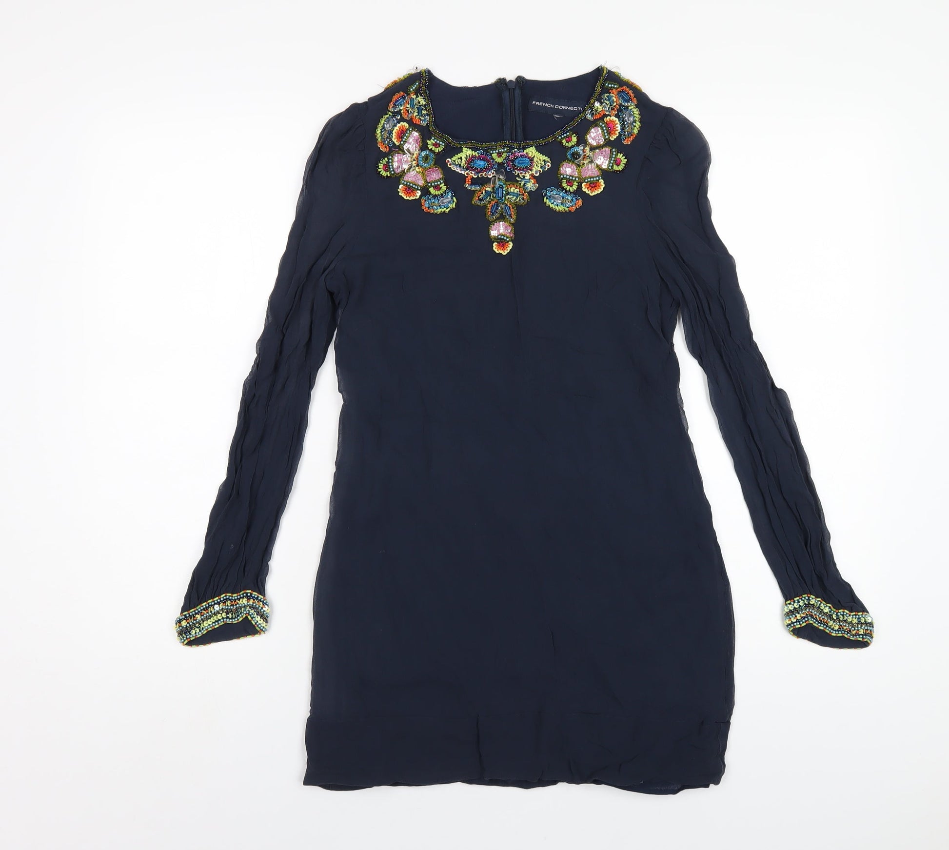 French Connection Womens Blue Silk A-Line Size S Round Neck Zip