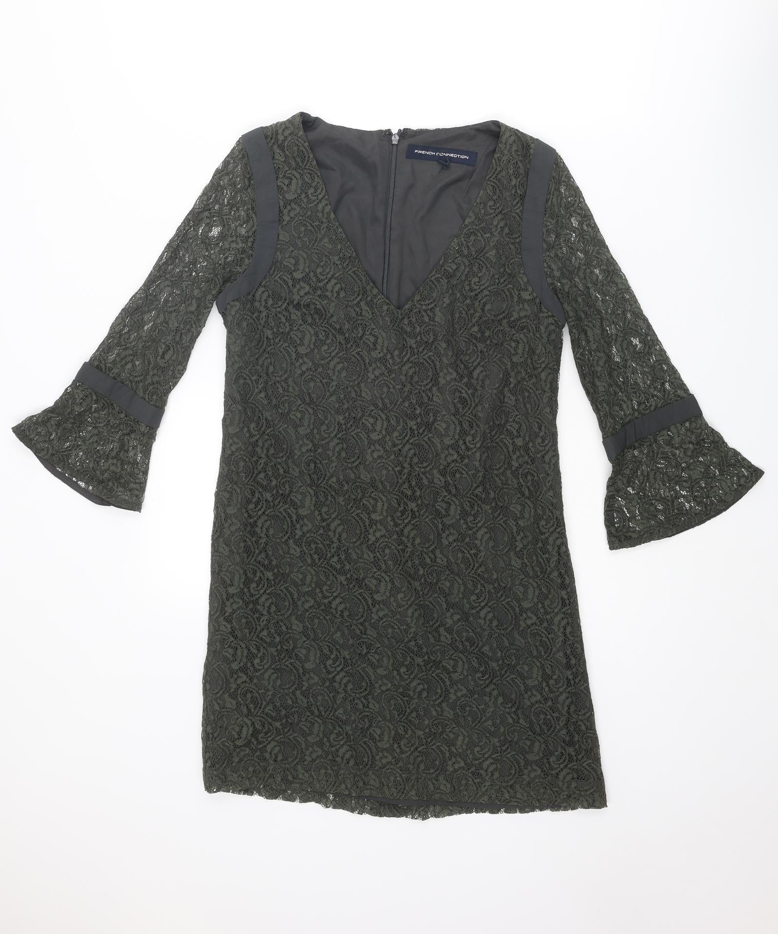 French Connection Womens Green Geometric Polyester Mini Size 8 V-Neck Zip