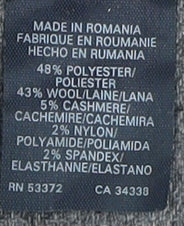 - Material Breakdown: 48% Polyester 43% Wool 5% Cashmere 2% Nylon 2% Elastane