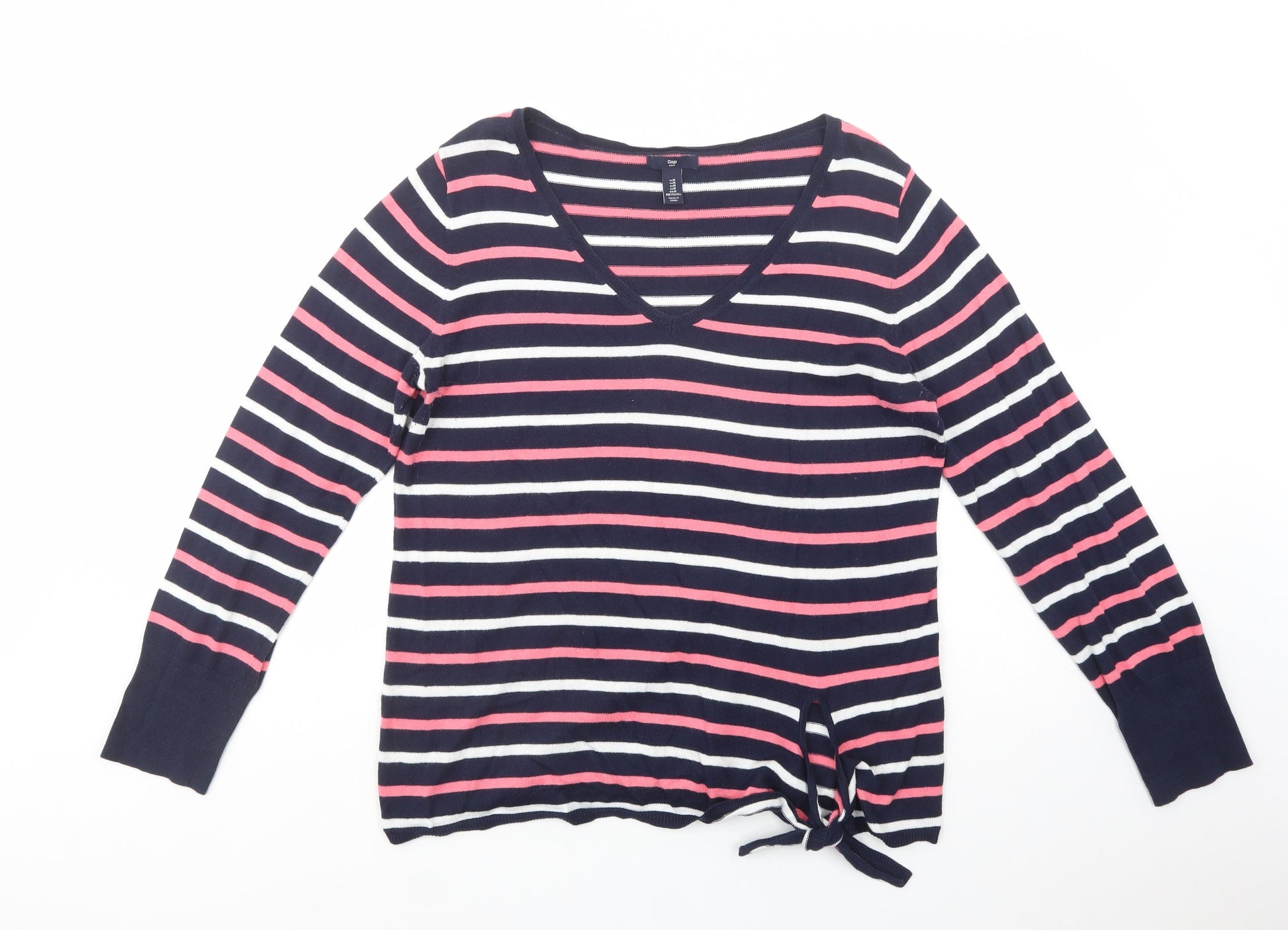 Gap Womens Blue V-Neck Striped Cotton Pullover Jumper Size M
