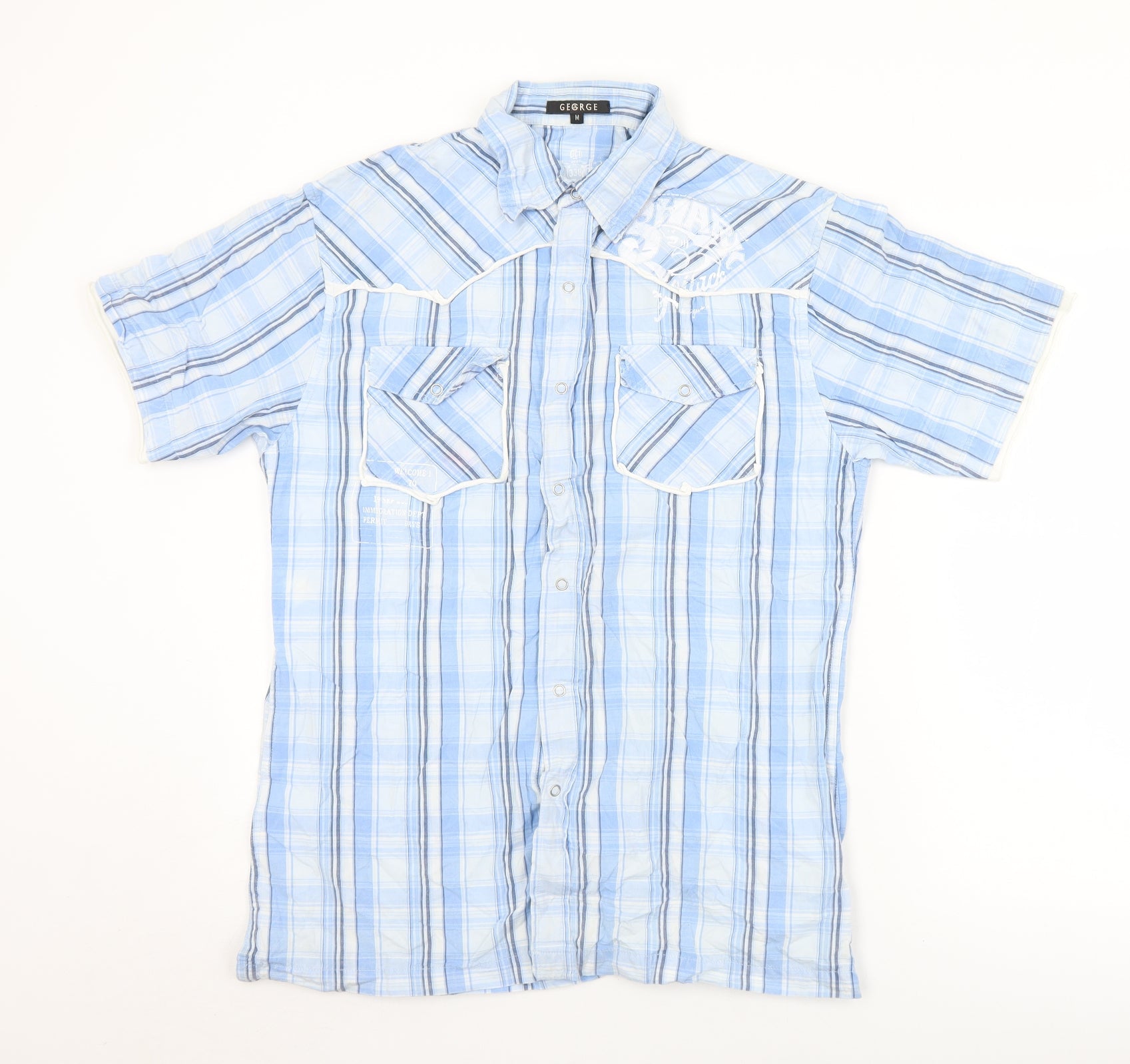 George Mens Blue Plaid Cotton Button-Up Size M Collared Snap - Shark