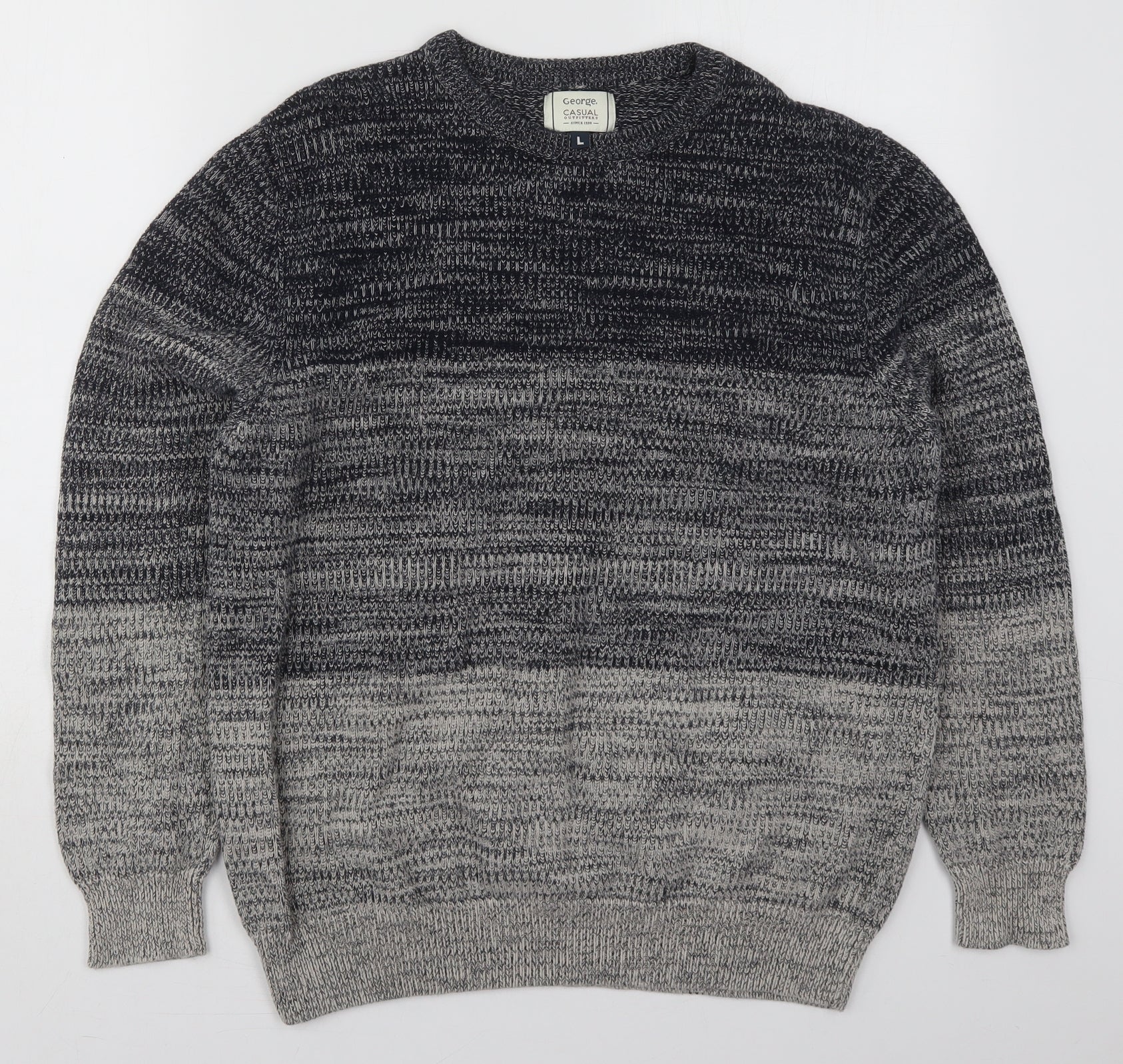 George Mens Grey Crew Neck Striped Cotton Pullover Jumper Size L