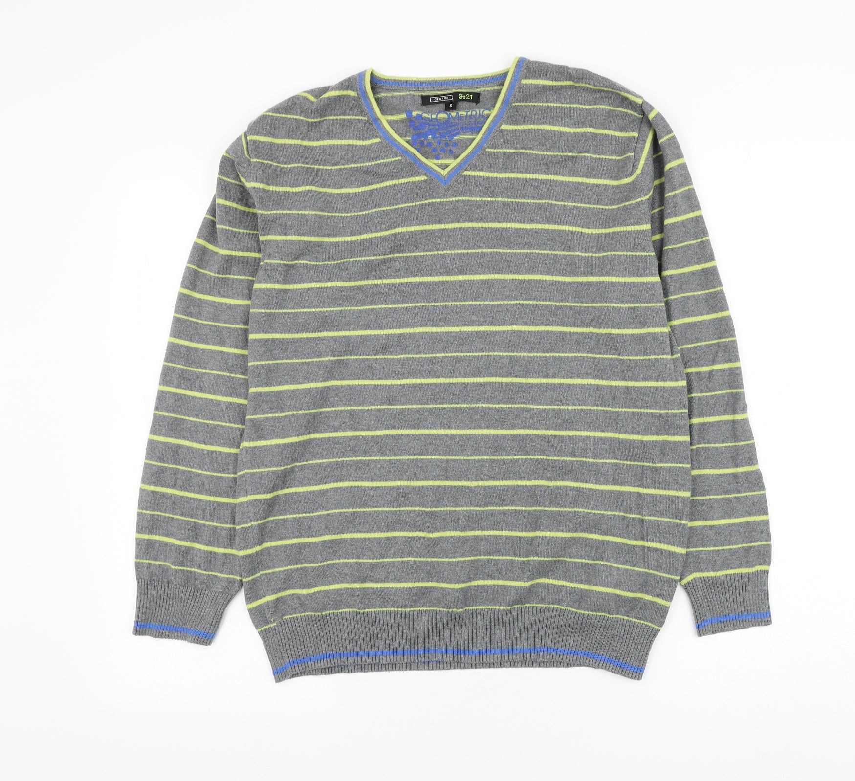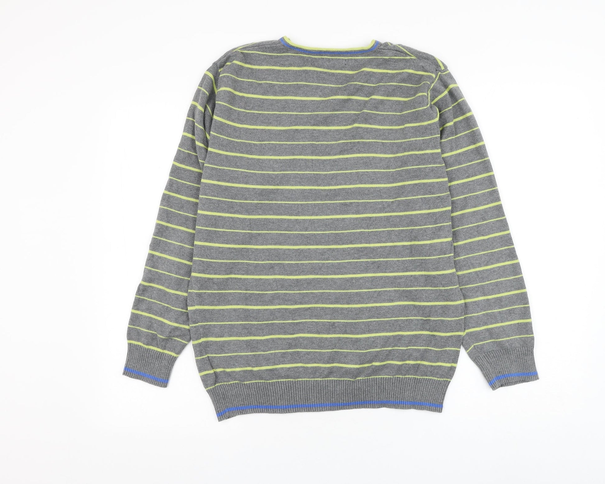 George Mens Grey V-Neck Striped Cotton Pullover Jumper Size S