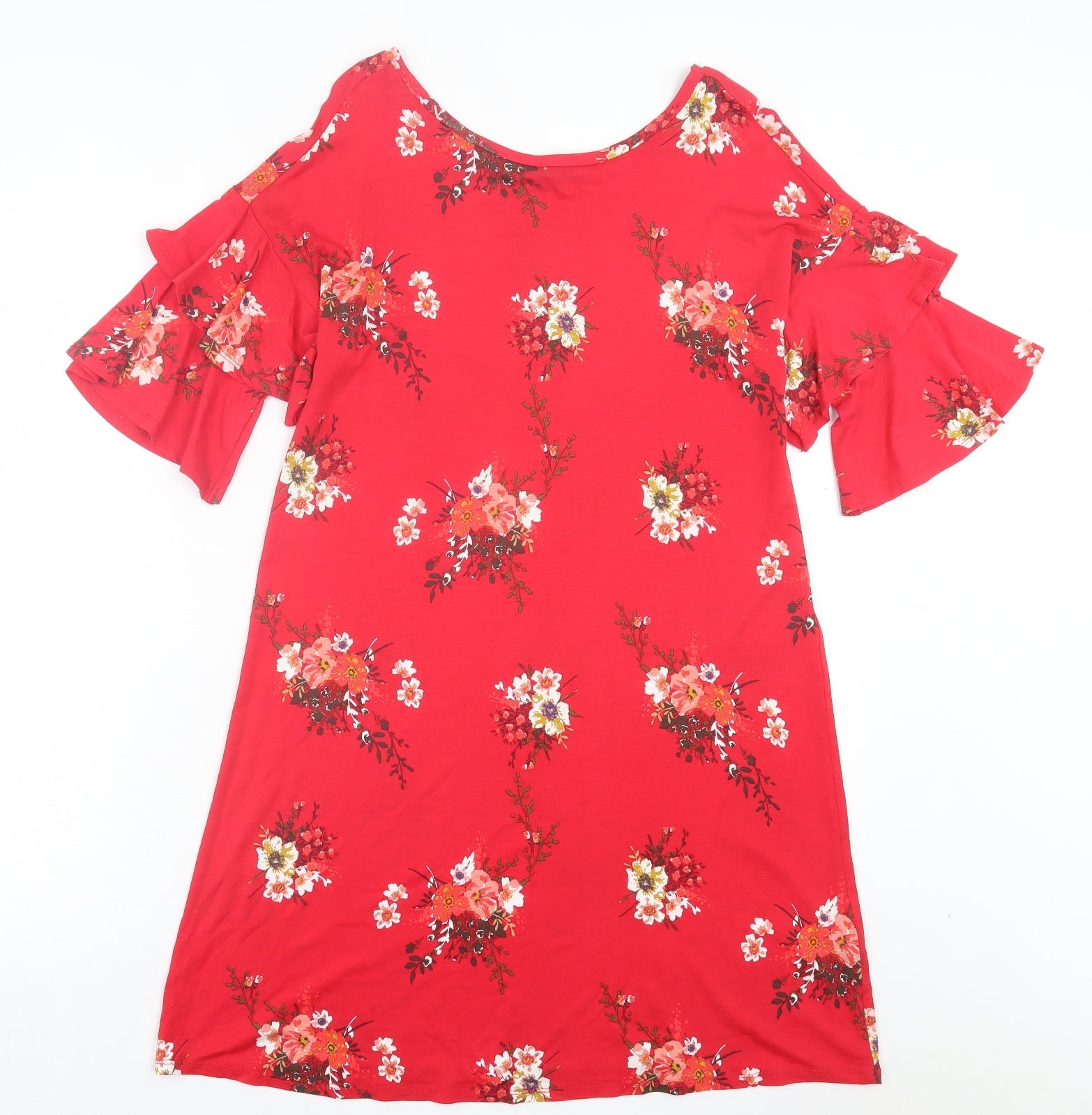 George Womens Red Floral Viscose A-Line Size 10 Crew Neck Pullover - Frill Sleeves