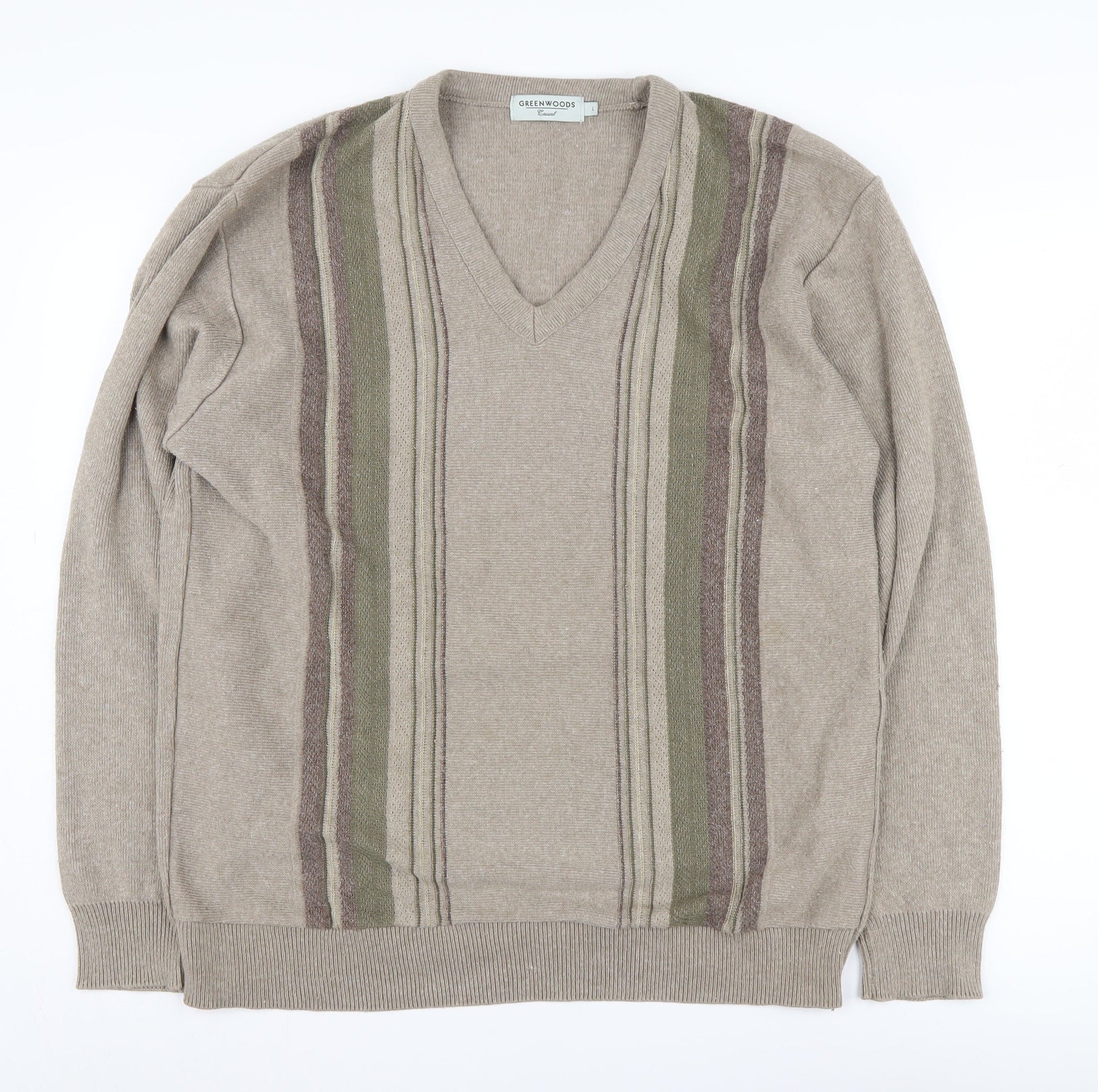 Greenwoods Men's Beige V-Neck Striped Pullover - L
