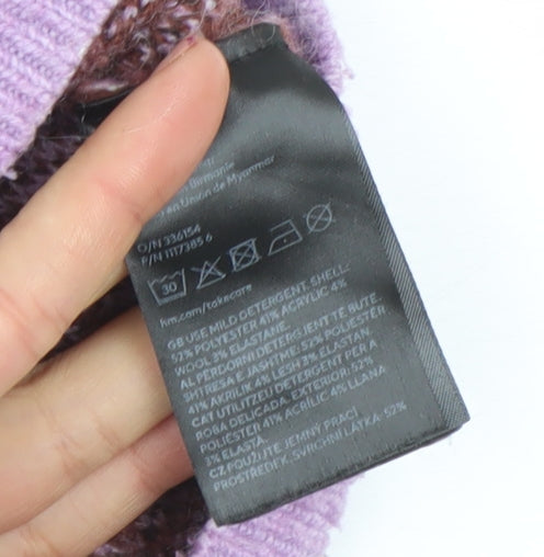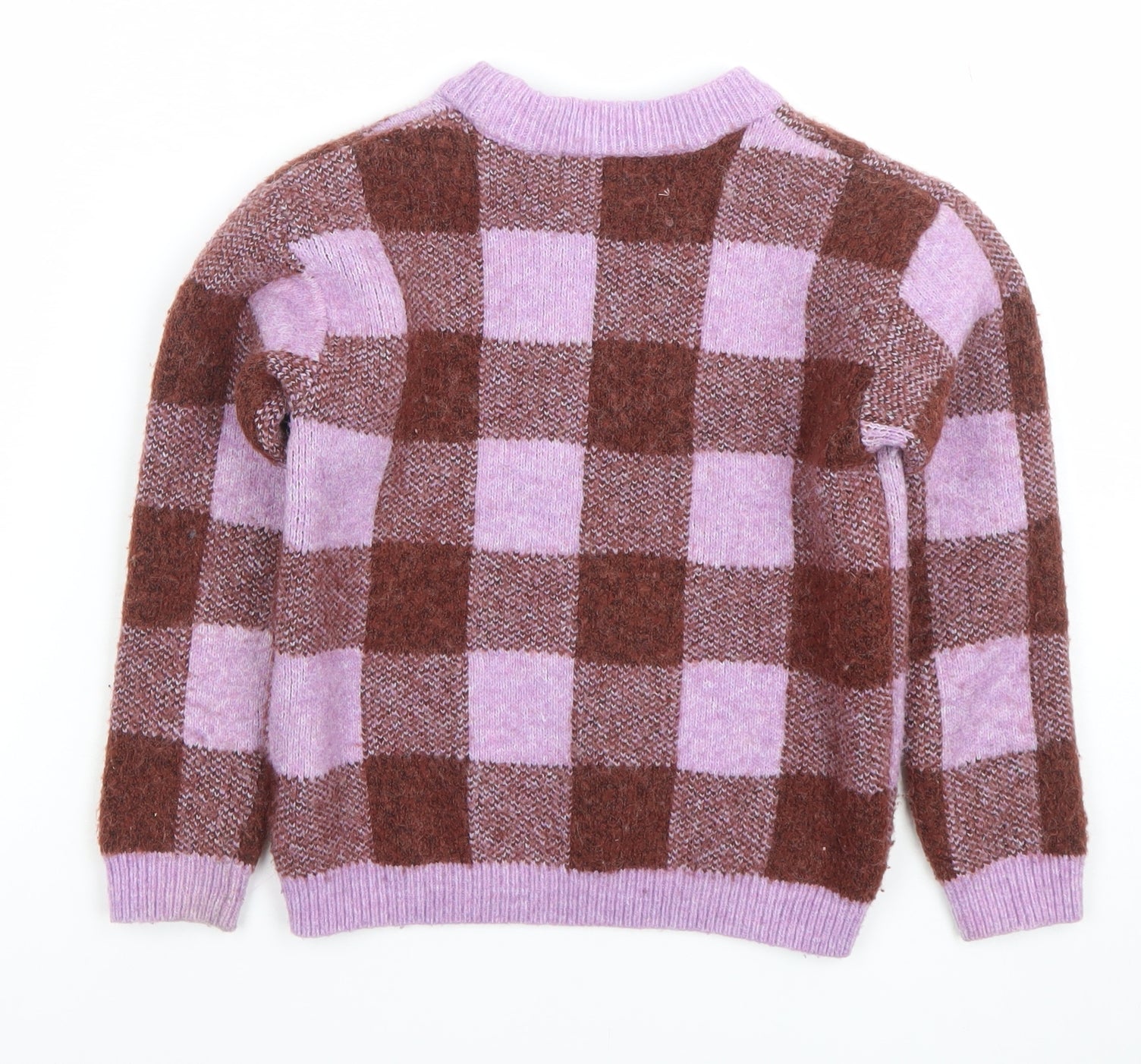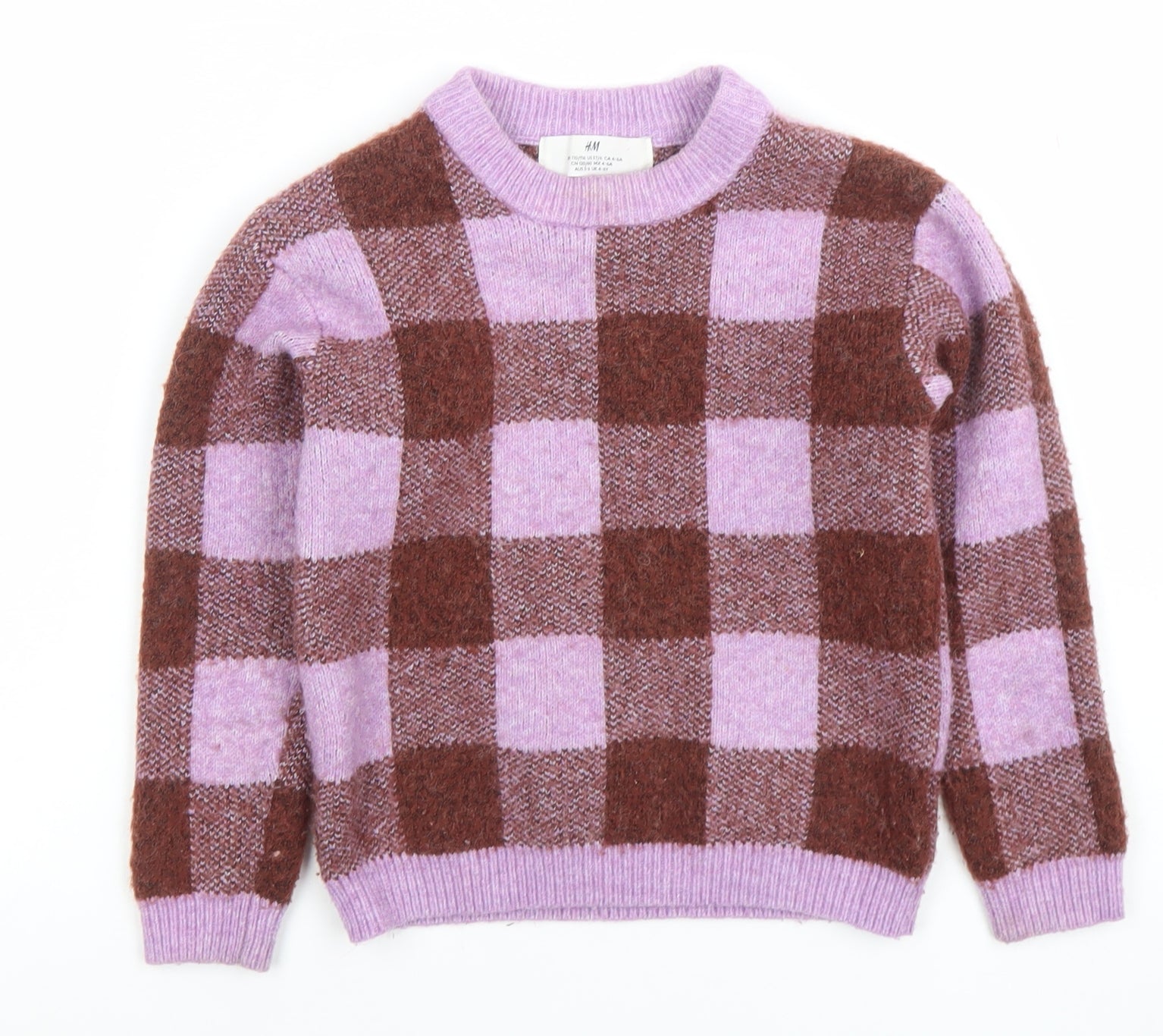 H&M Girls Brown & Lilac Check Jumper 4-6 Years Acrylic Blend Crew Neck