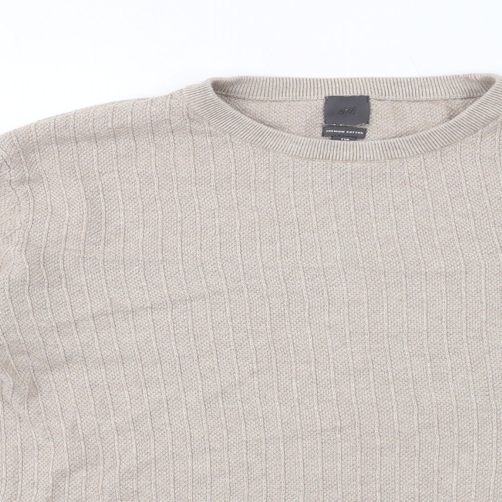 H&M Mens Beige Round Neck Cotton Pullover Jumper Size L Long Sleeve