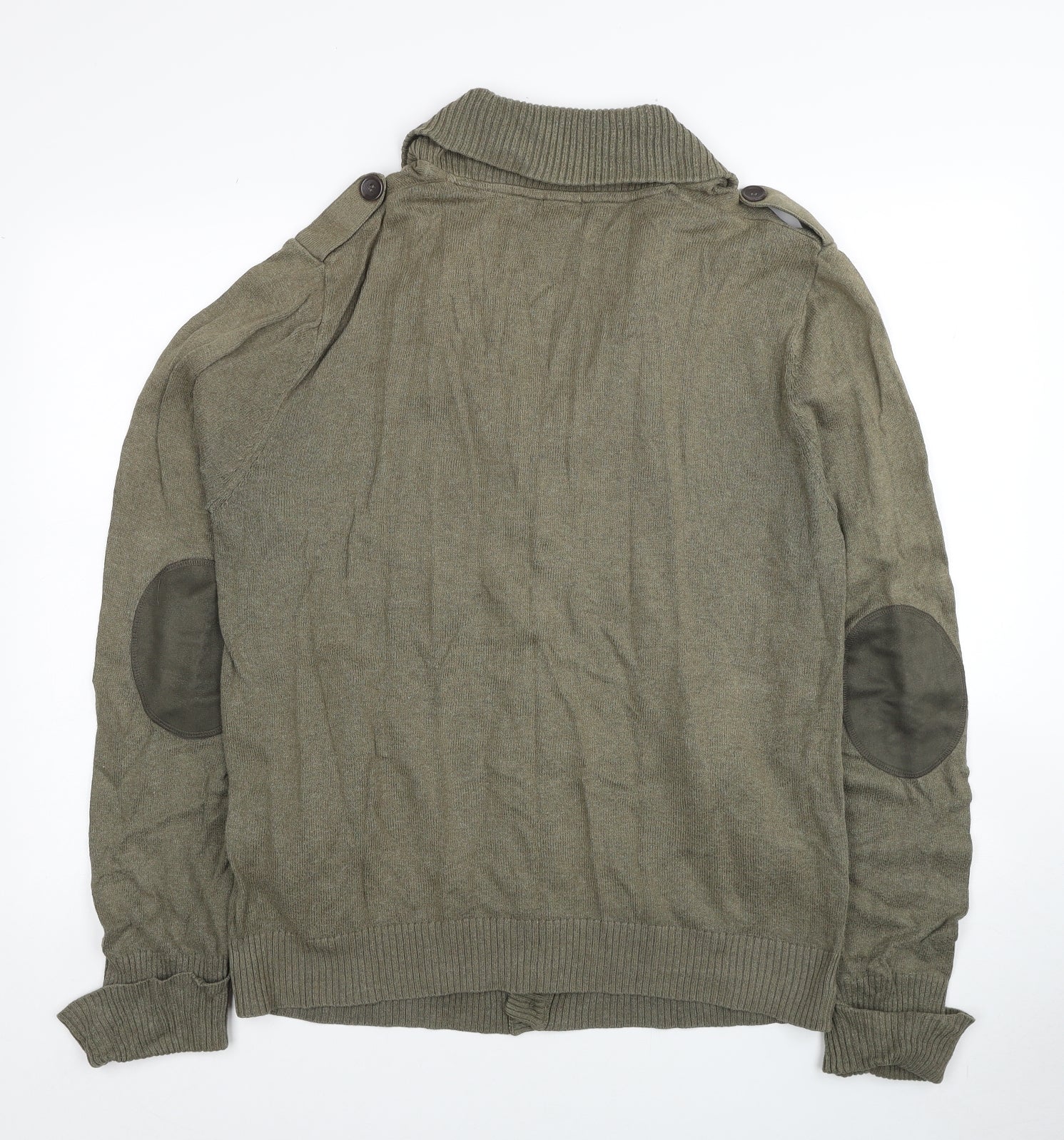 H&M Mens Green V-Neck Cotton Cardigan Jumper Size L - Elbow Patches