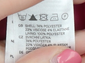 - Material Breakdown: 74% Polyester 22% Viscose 4% Elastane