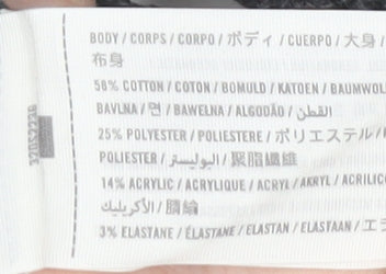 - Material Breakdown: 58% Cotton 25% Polyester 14% Acrylic 3% Elastane