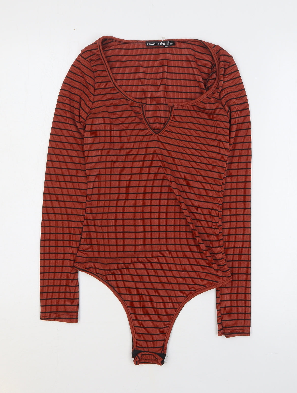 I SAW IT FIRST Womens Brown Striped Polyester Bodysuit One-Piece Size 8 Pullover
