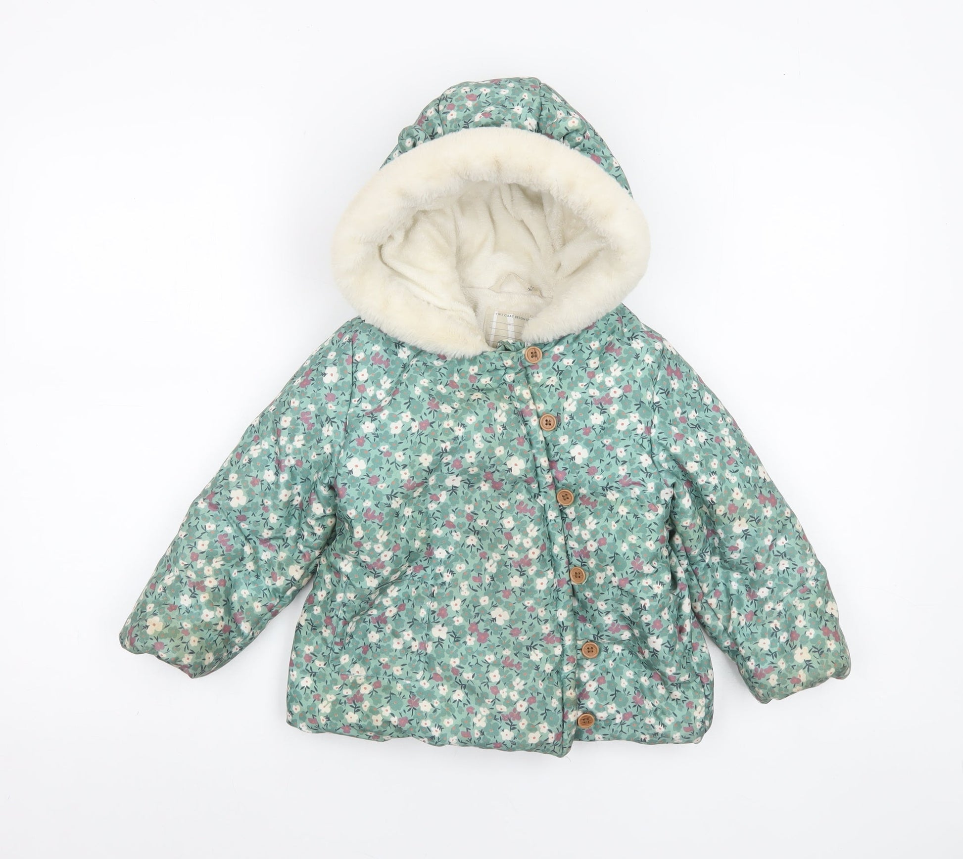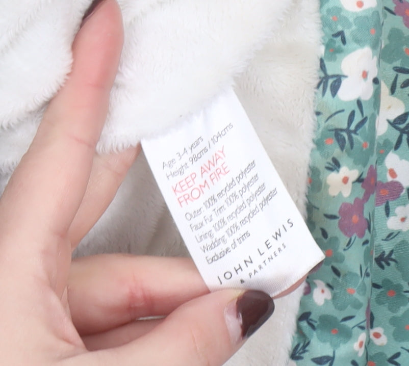 John Lewis Girls Green Floral Hooded Puffer Coat 3-4 Years