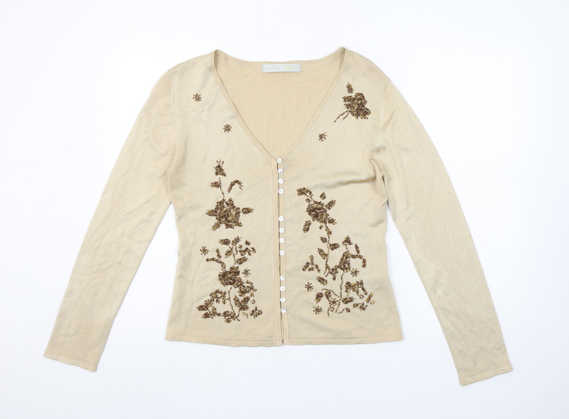 Kaliko Women Beige Floral Beaded V-Neck Long Sleeve Cardigan Size 12
