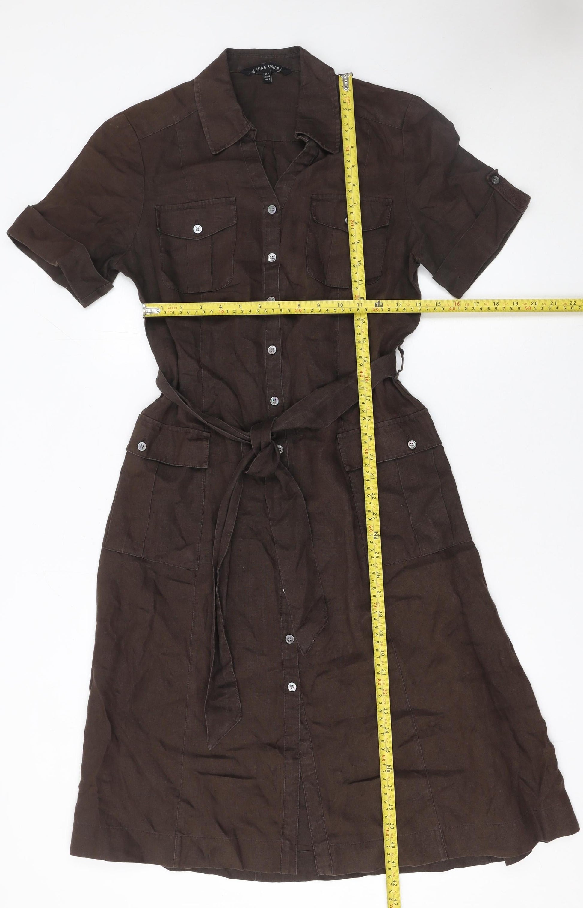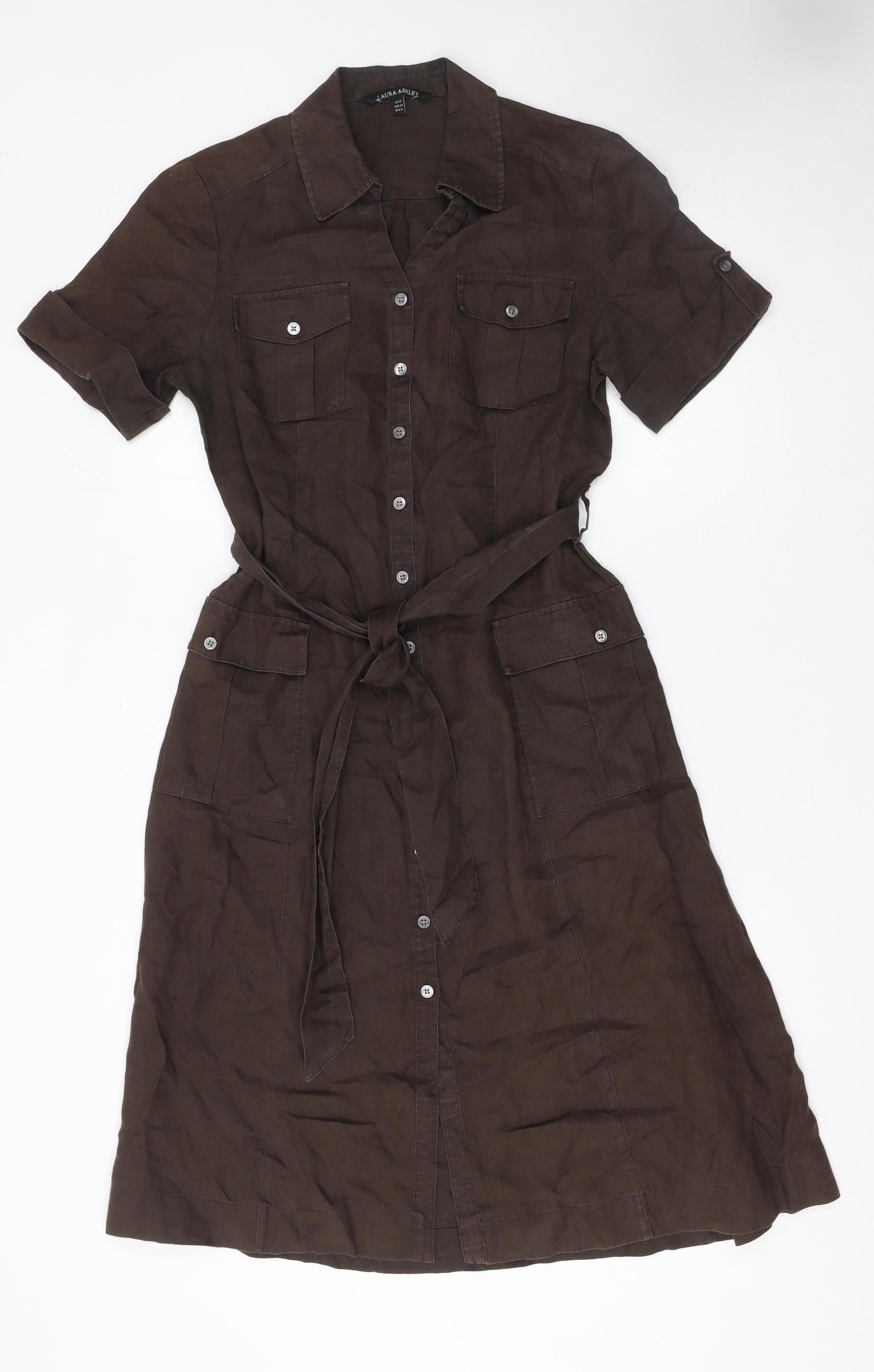 Laura Ashley Women Brown Linen Shirt Dress Size 12 Belted Short Sleeve