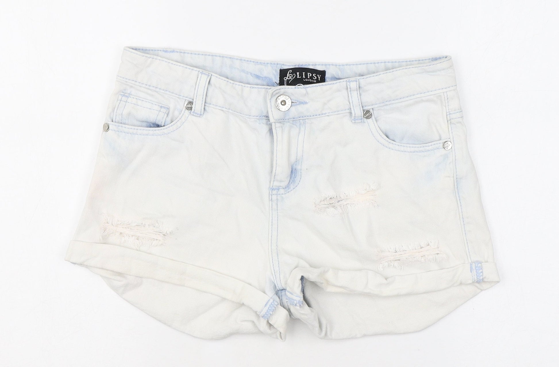 Lipsy Womens Blue Polyester Hot Pants Shorts Size 8 L3 in Regular Zip - Washed Colour Effect, Distressed Look