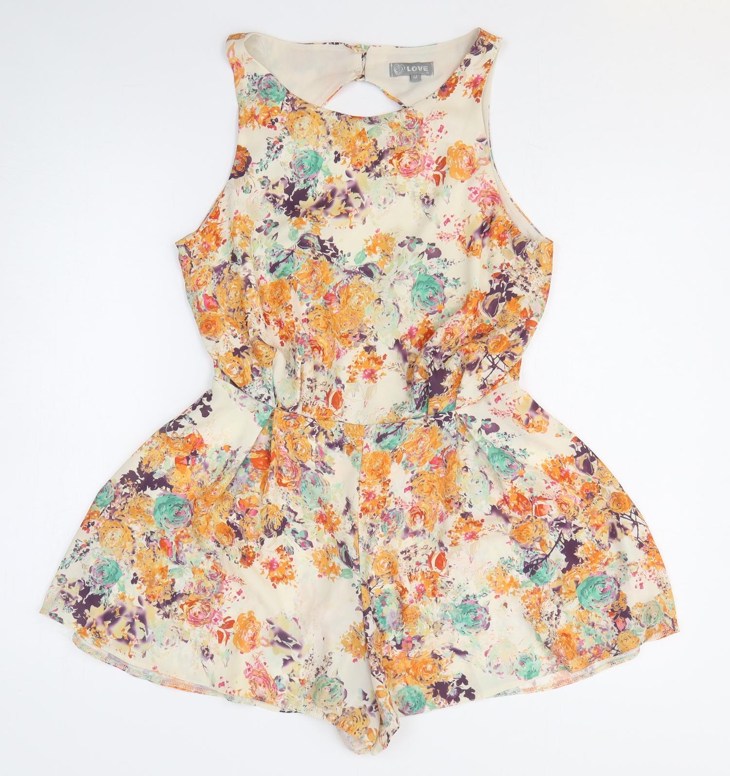 Love Womens Orange Floral Polyester Romper One-Piece Size M Pullover - Open Back