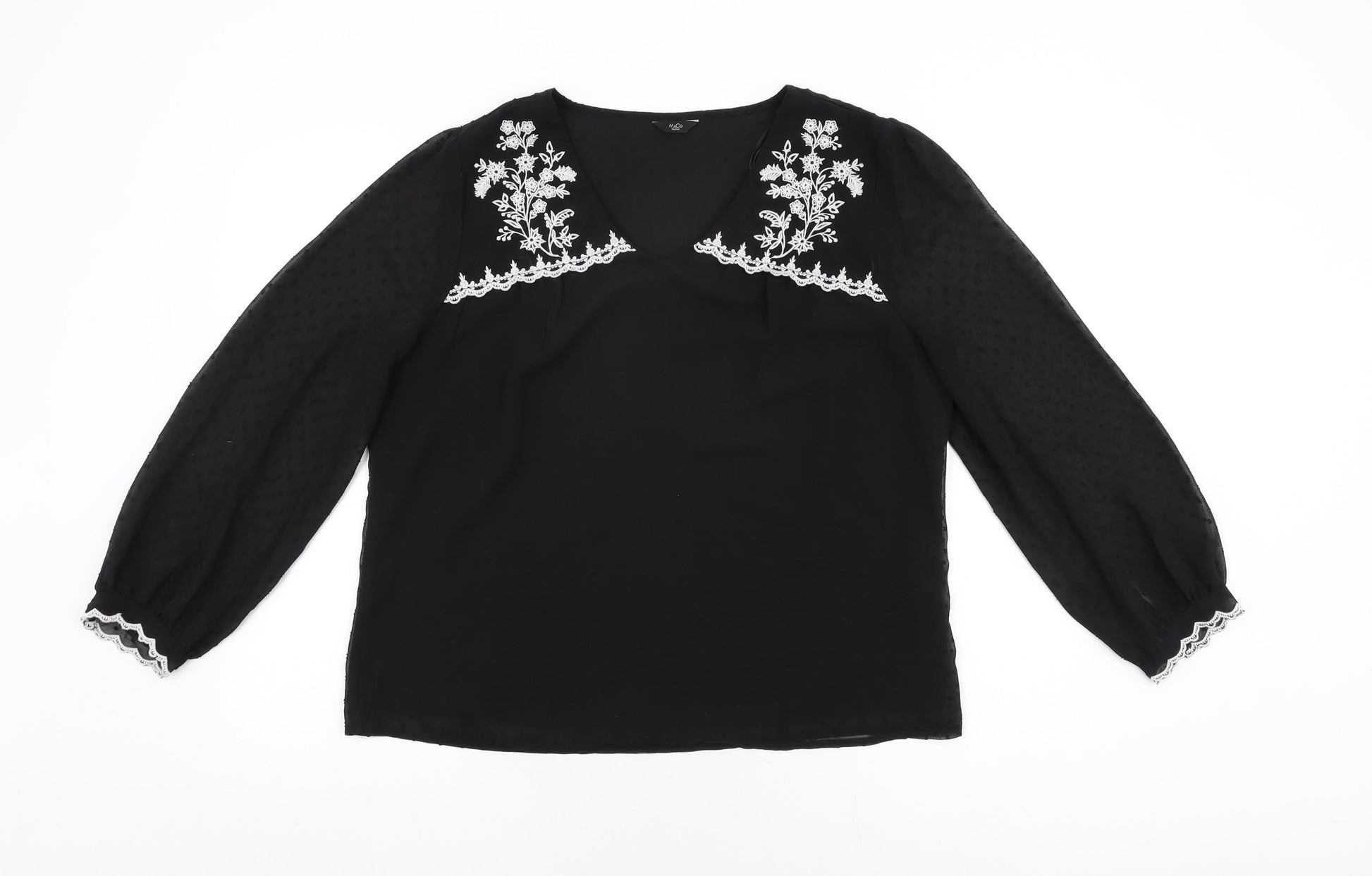 M&Co Womens Black Floral Polyester Basic Blouse Size 16 V-Neck