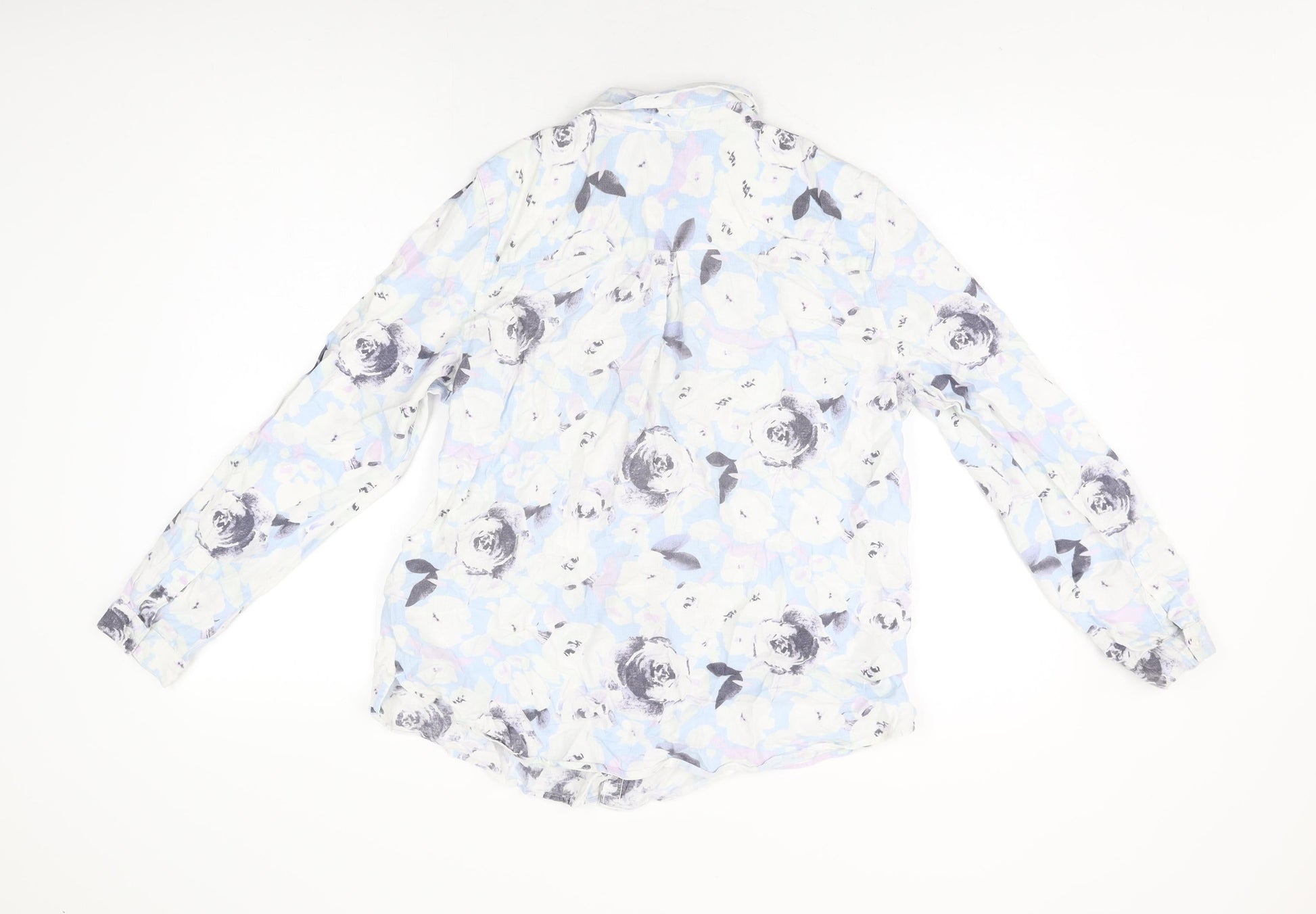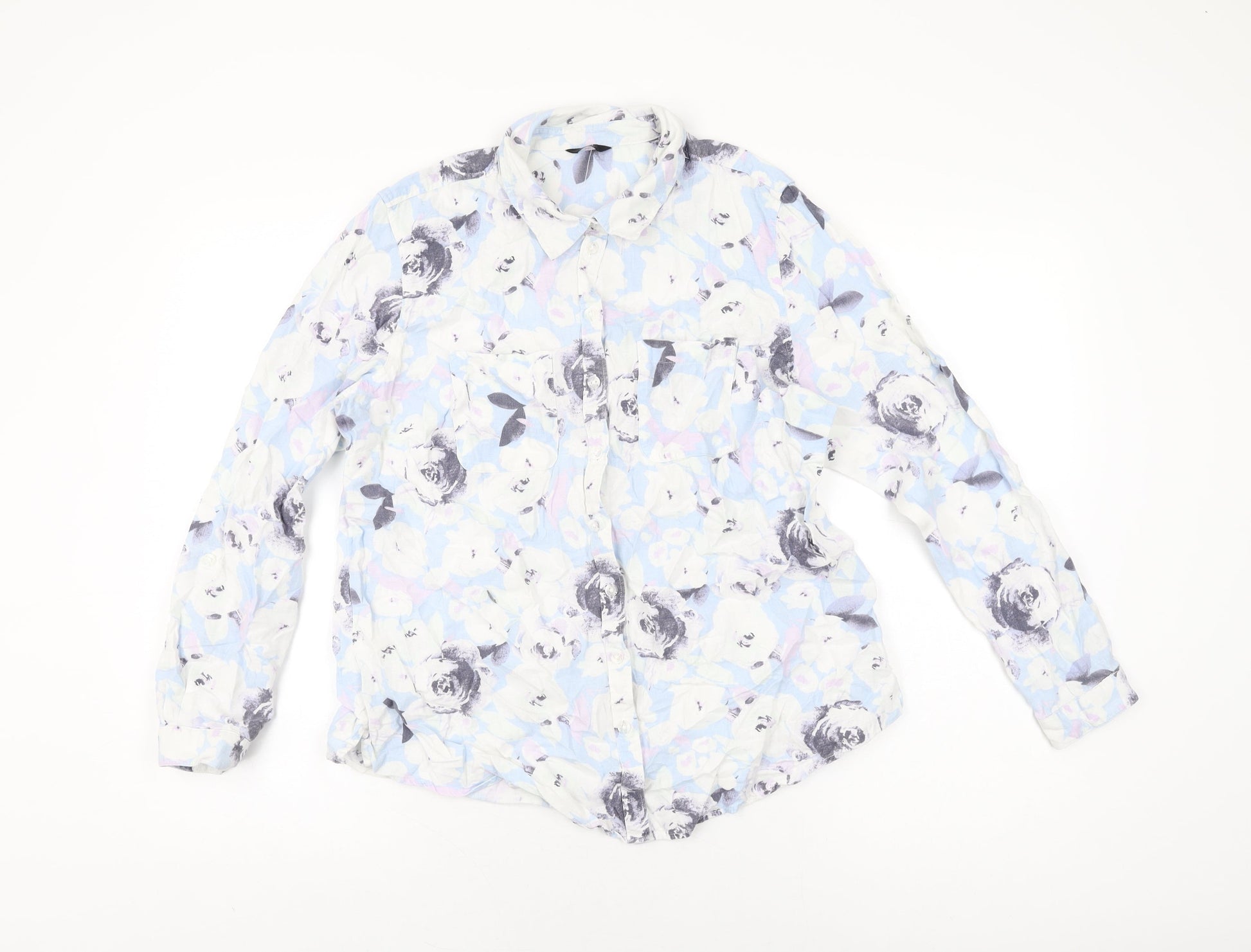 M&Co Womens Blue Floral Linen Basic Button-Up Size 14 Collared