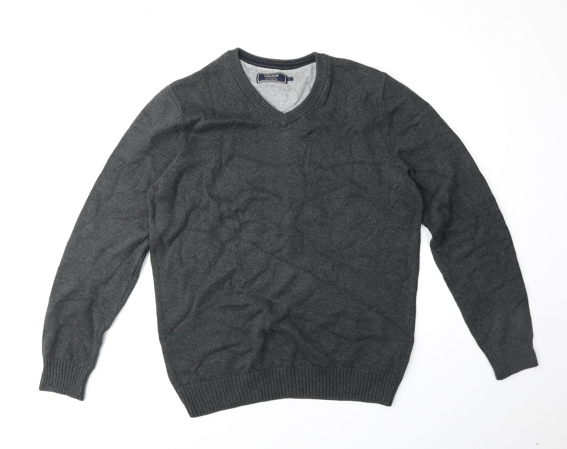 Maine Mens Grey V-Neck Cotton Pullover Jumper Size M
