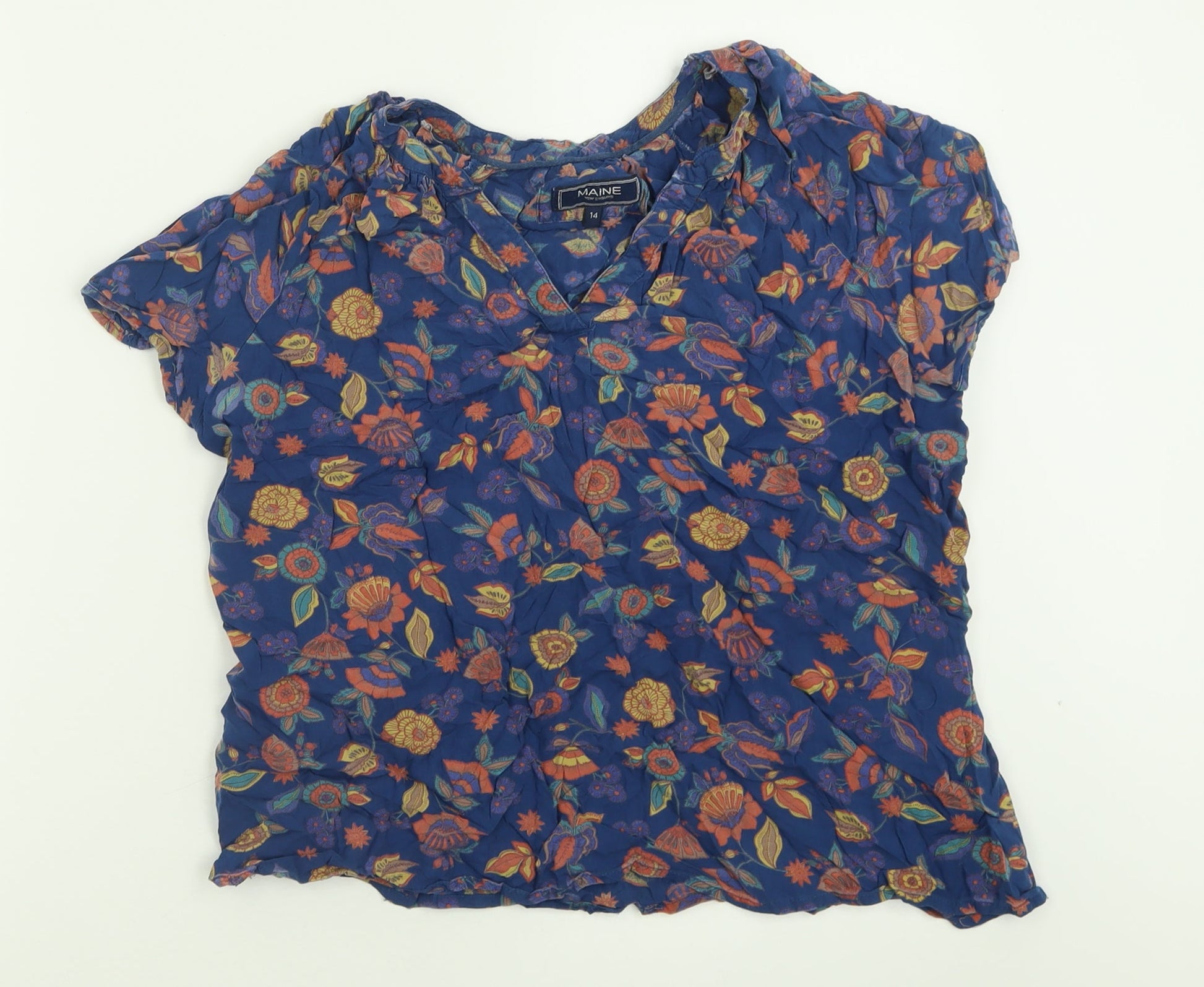 Maine Womens Blue Floral Viscose Basic T-Shirt Size 14 V-Neck
