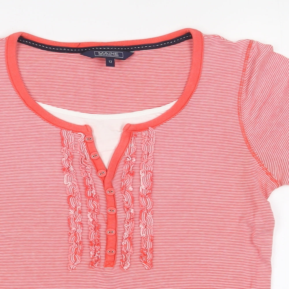 Maine Womens Red Striped Cotton Basic T-Shirt Size 12 Crew Neck - Embroidered, Buttons