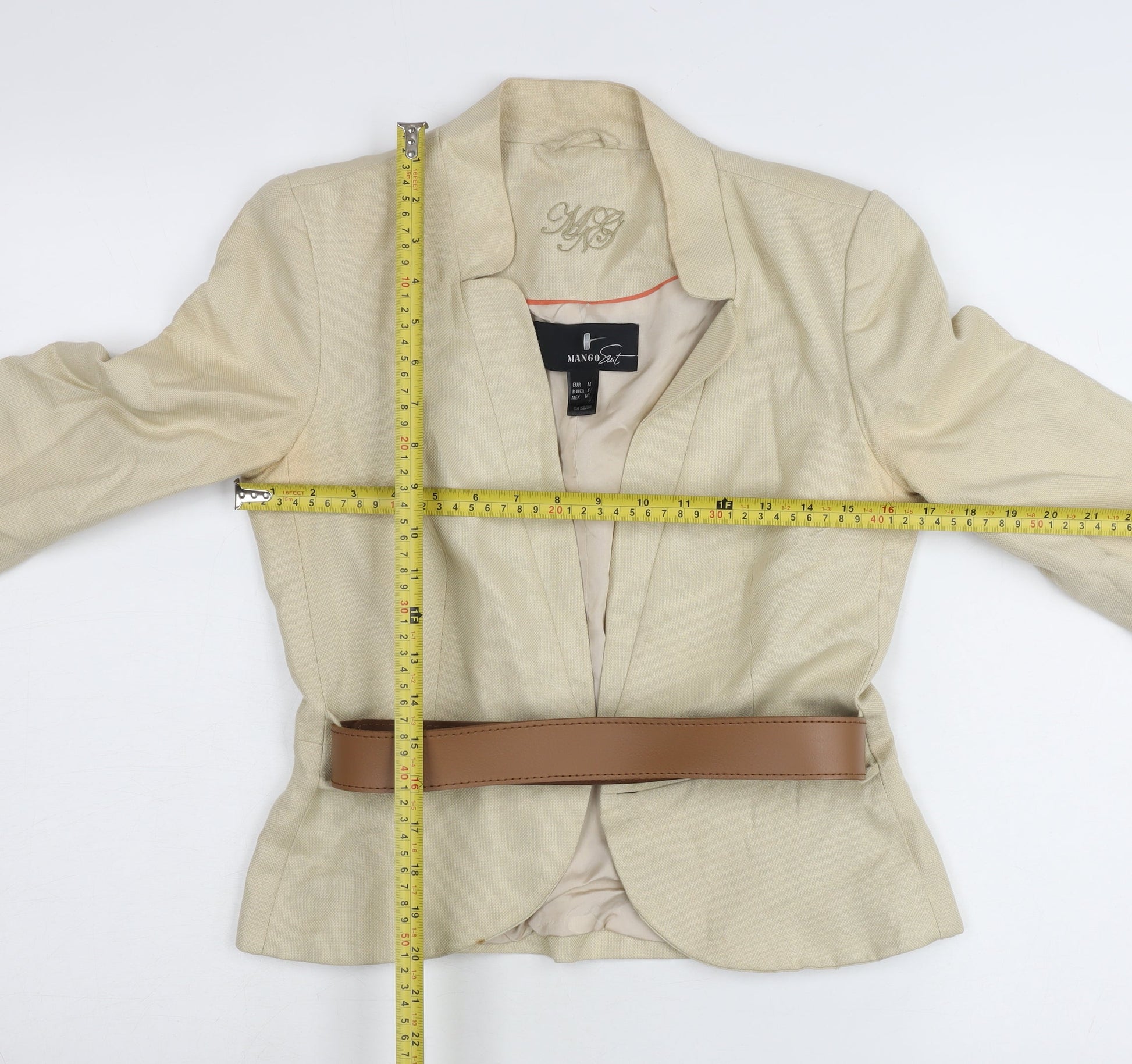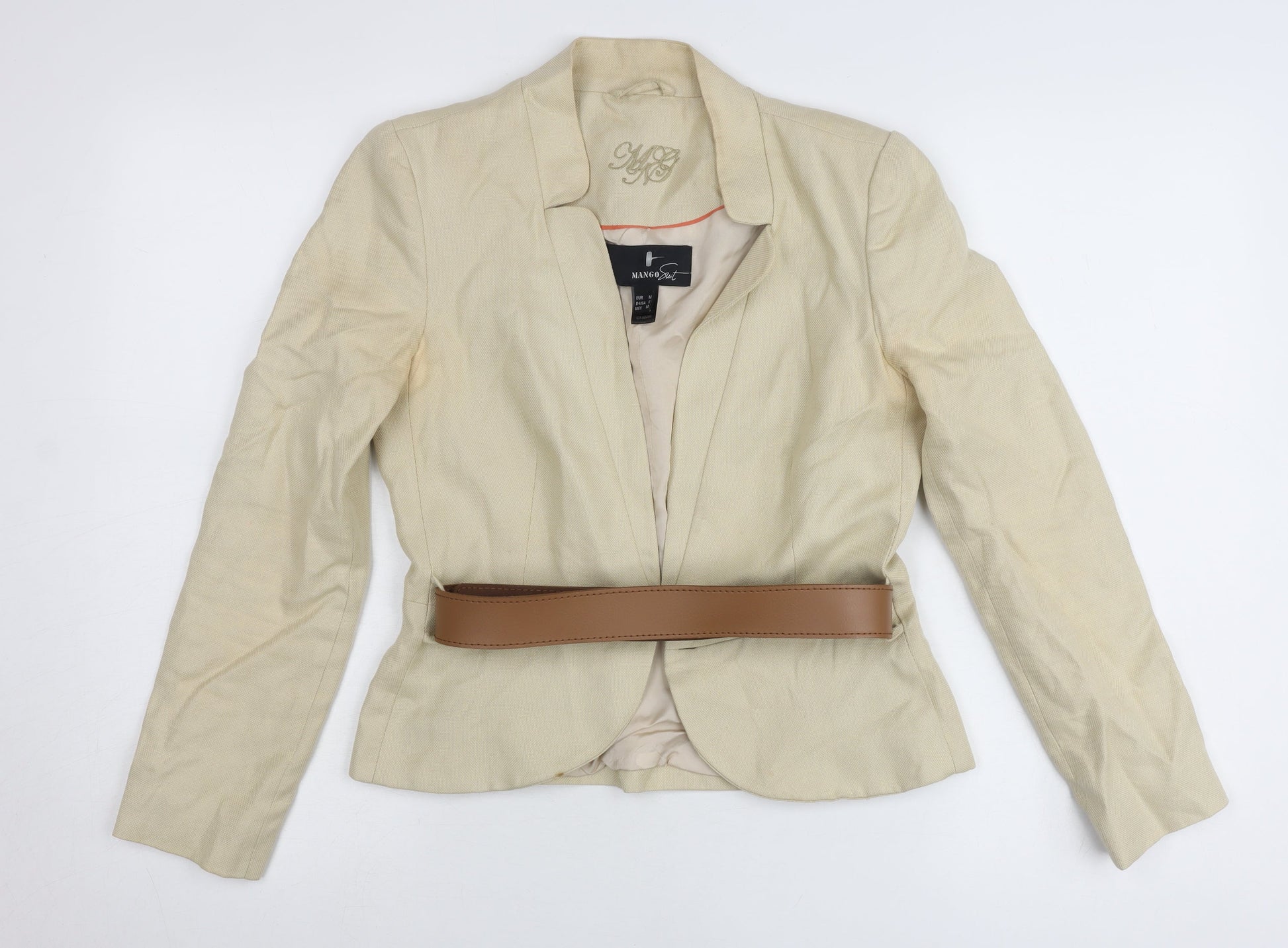 Mango Women Beige Linen Blend Blazer Jacket Size 12 Belted Workwear