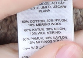 - Material Breakdown: 60% Cotton 30% Nylon 10% Wool