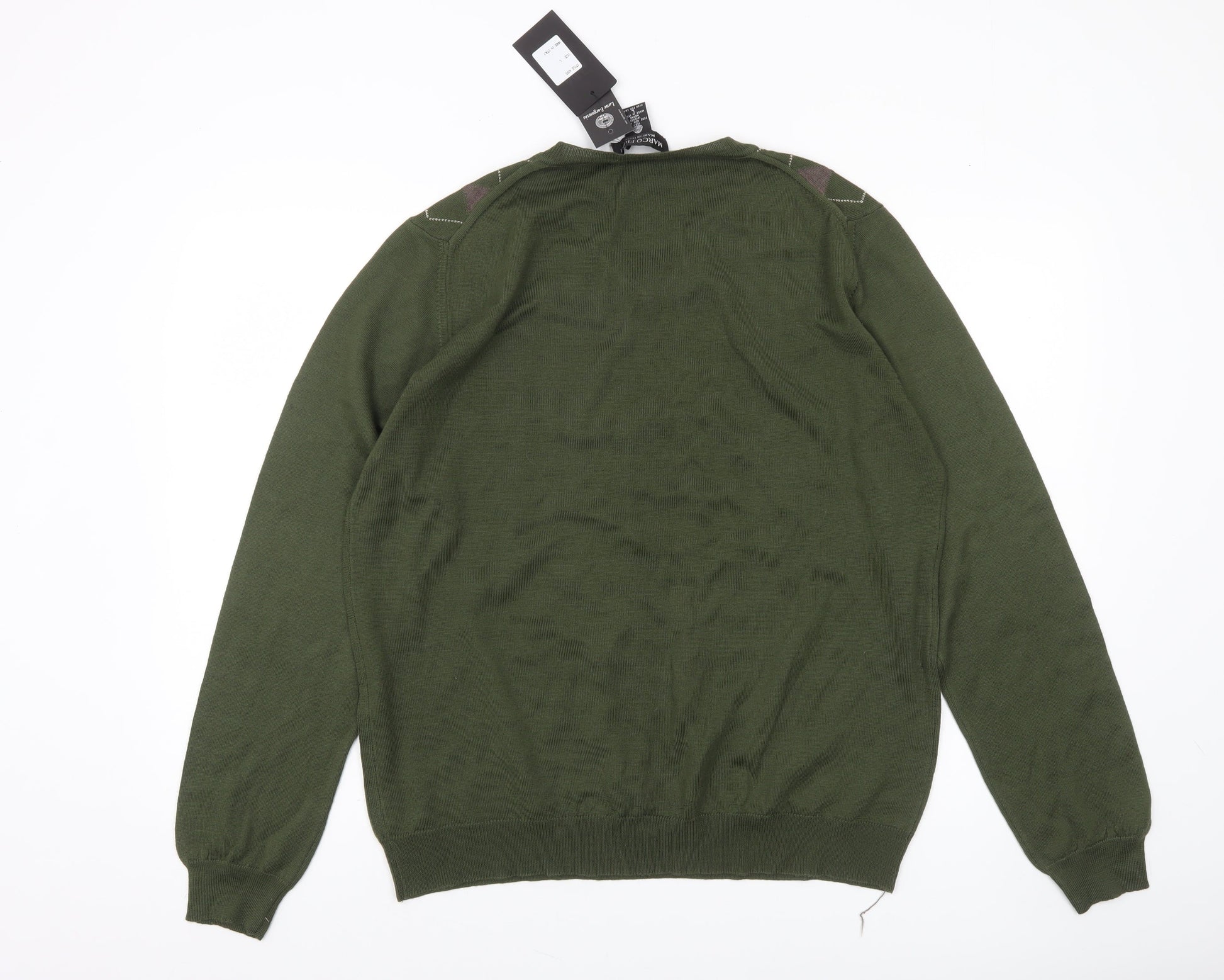 Marco Fiori Men's Green Argyle Merino Wool V-Neck Jumper Size L