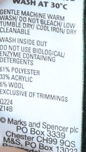 - Material Breakdown: 61% Polyester 33% Acrylic 6% Wool