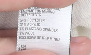 - Material Breakdown: 54% Polyester 39% Acrylic 4% Elastane 3% Wool
