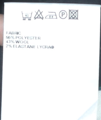 - Material Breakdown: 55% Polyester 43% Wool 2% Elastane
