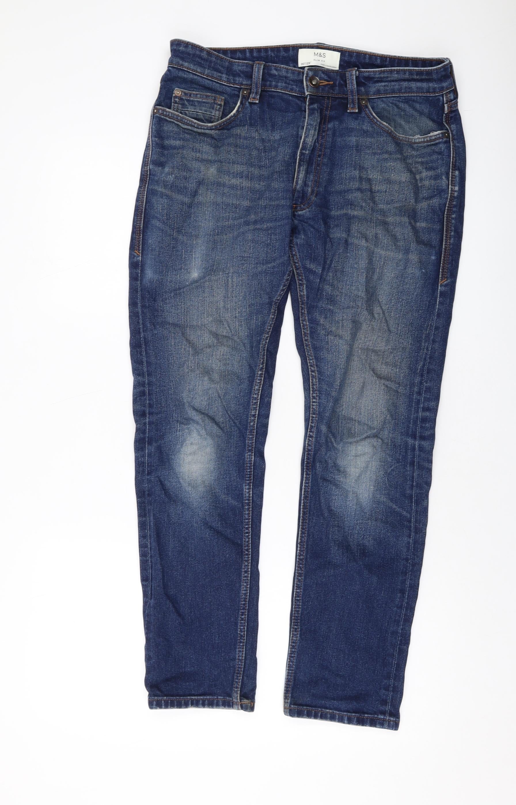 Marks and Spencer Mens Blue Cotton Straight Jeans Size 30 in L29 in Slim Button