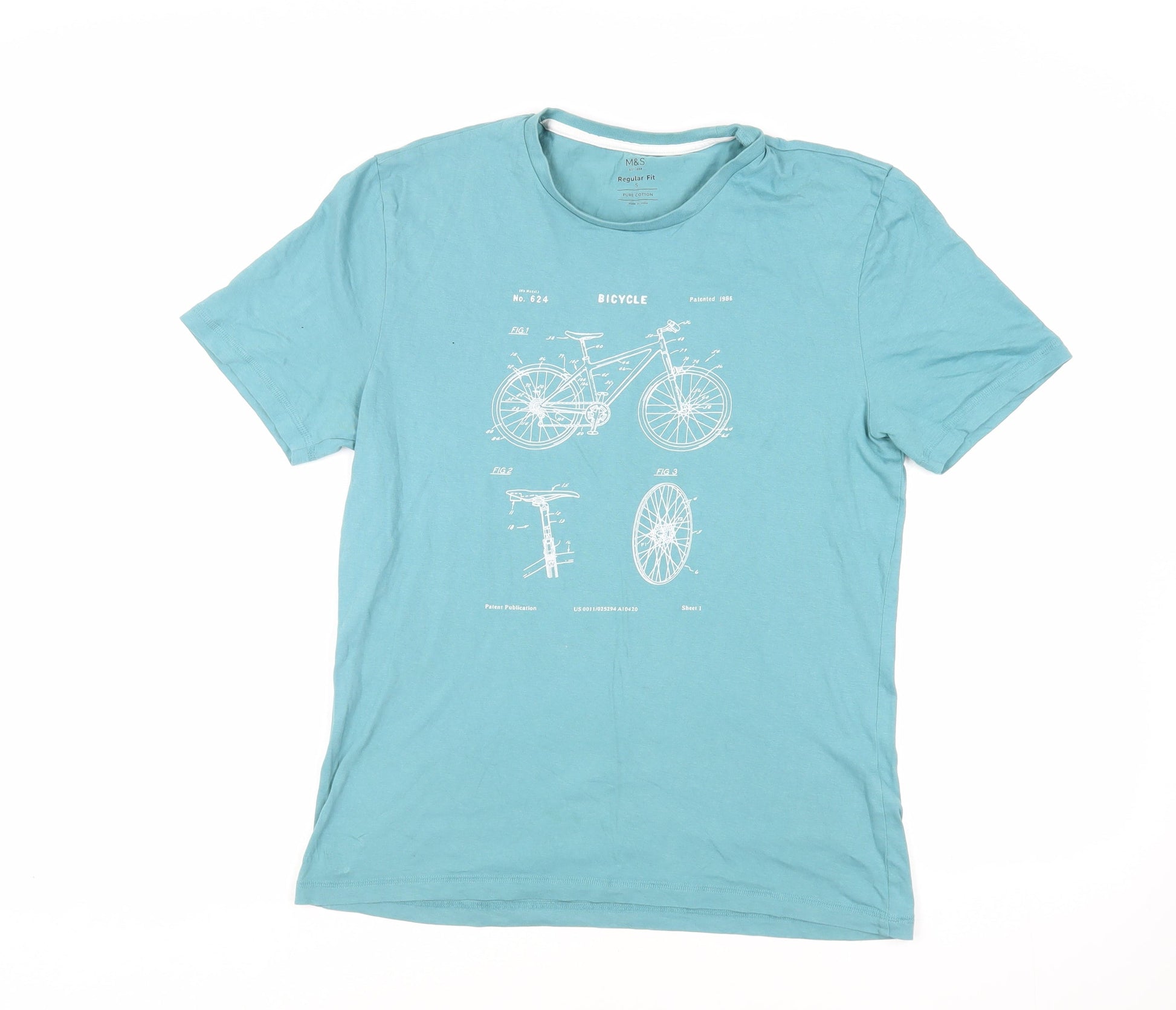 Marks and Spencer Mens Blue Cotton T-Shirt Size S Crew Neck - Bicycle Print