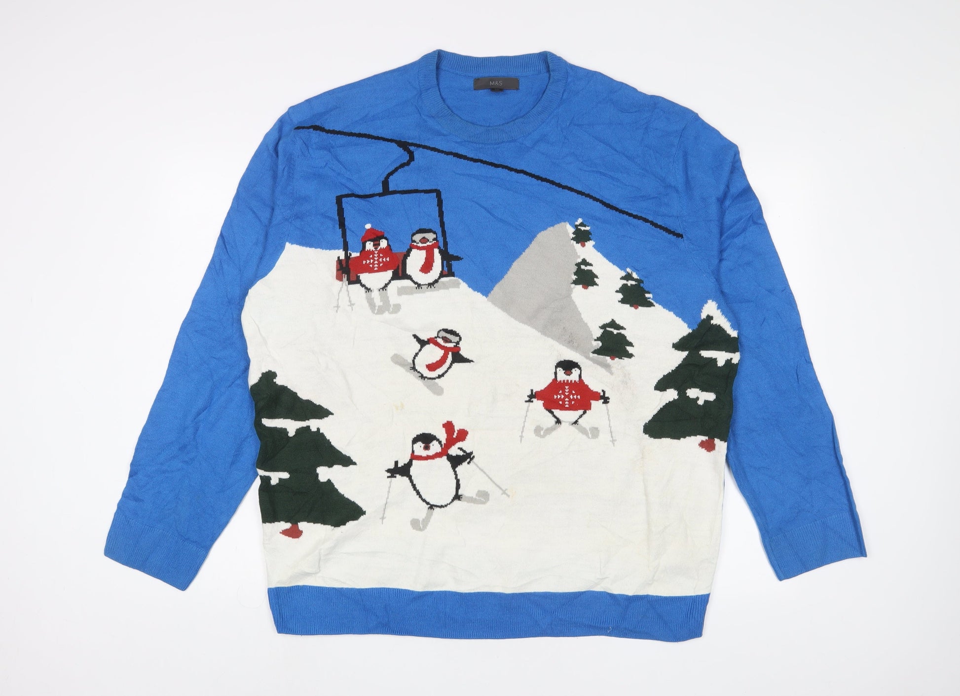 Marks and Spencer Mens Blue Crew Neck Geometric Acrylic Pullover Jumper Size 2XL Long Sleeve