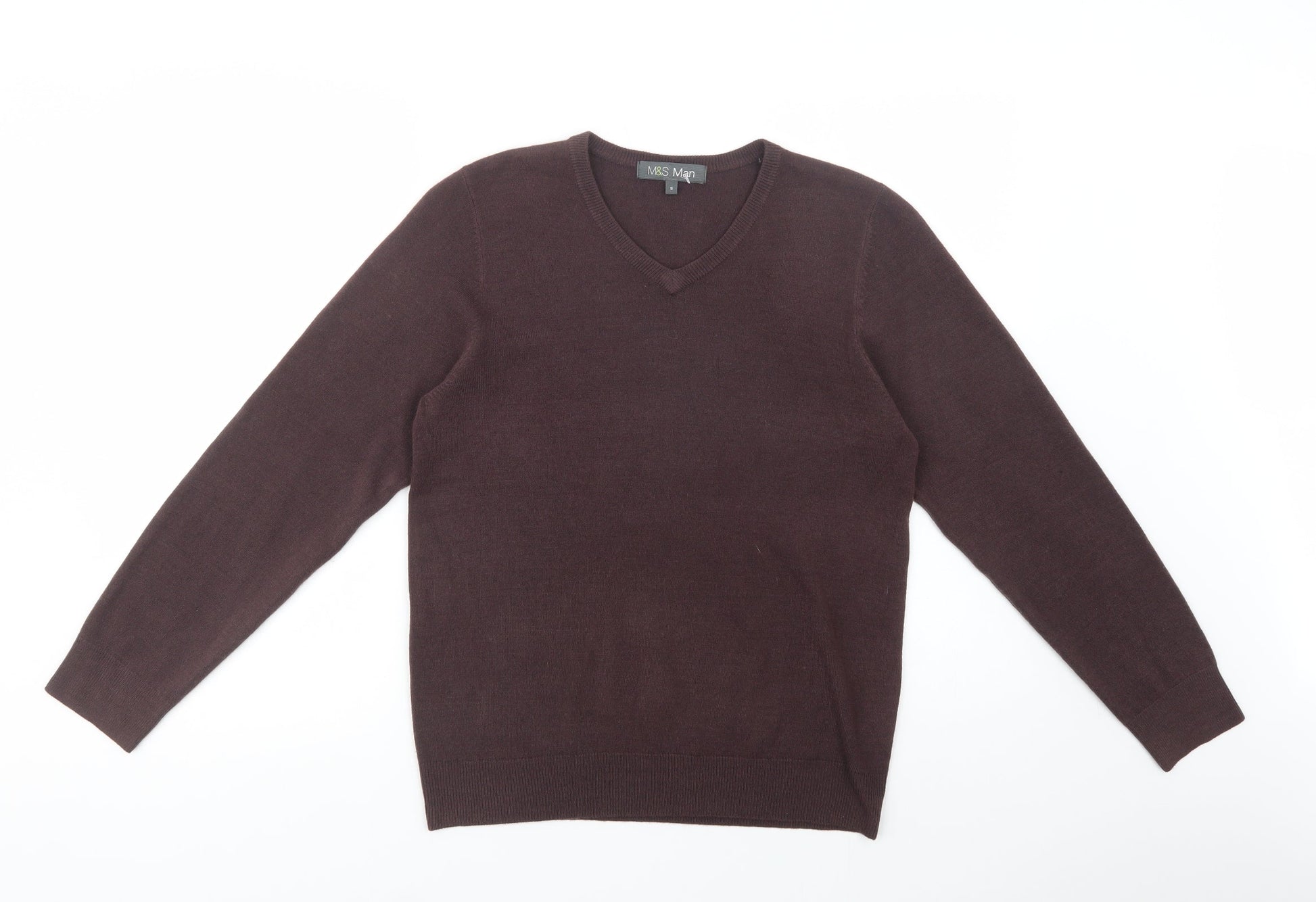 Marks and Spencer Mens Brown V-Neck Acrylic Pullover Jumper Size S