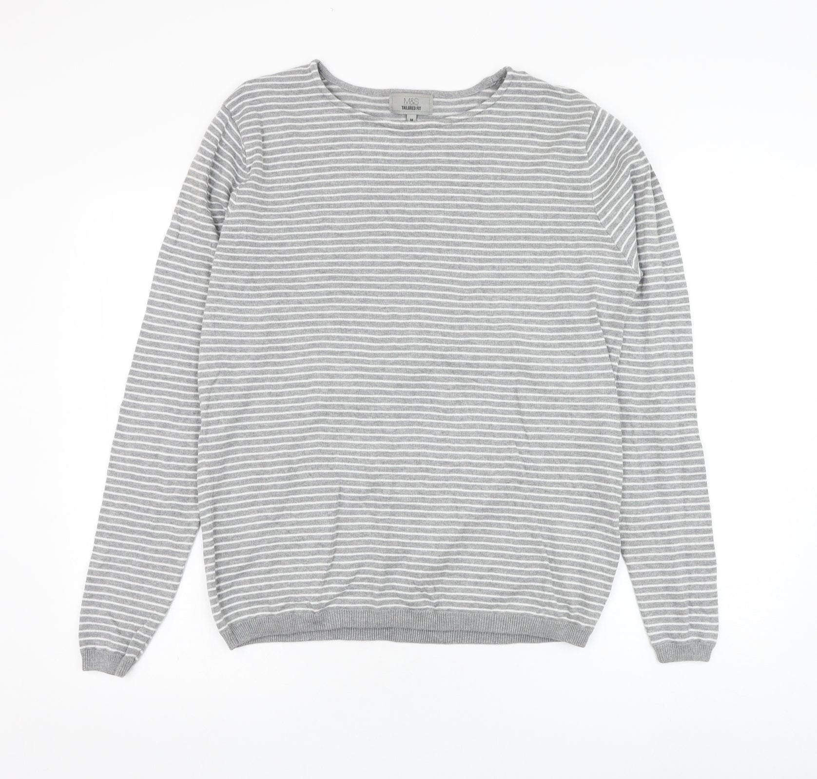 Marks and Spencer Mens Grey Round Neck Striped Cotton Pullover Jumper Size M