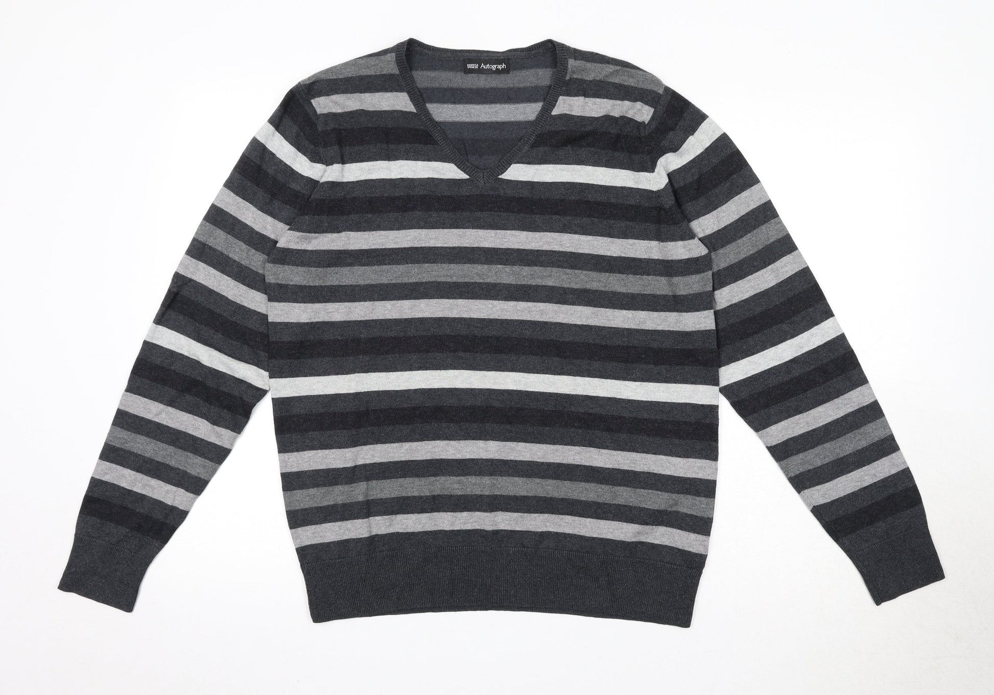 Marks and Spencer Mens Grey V-Neck Striped Cotton Pullover Jumper Size M Long Sleeve