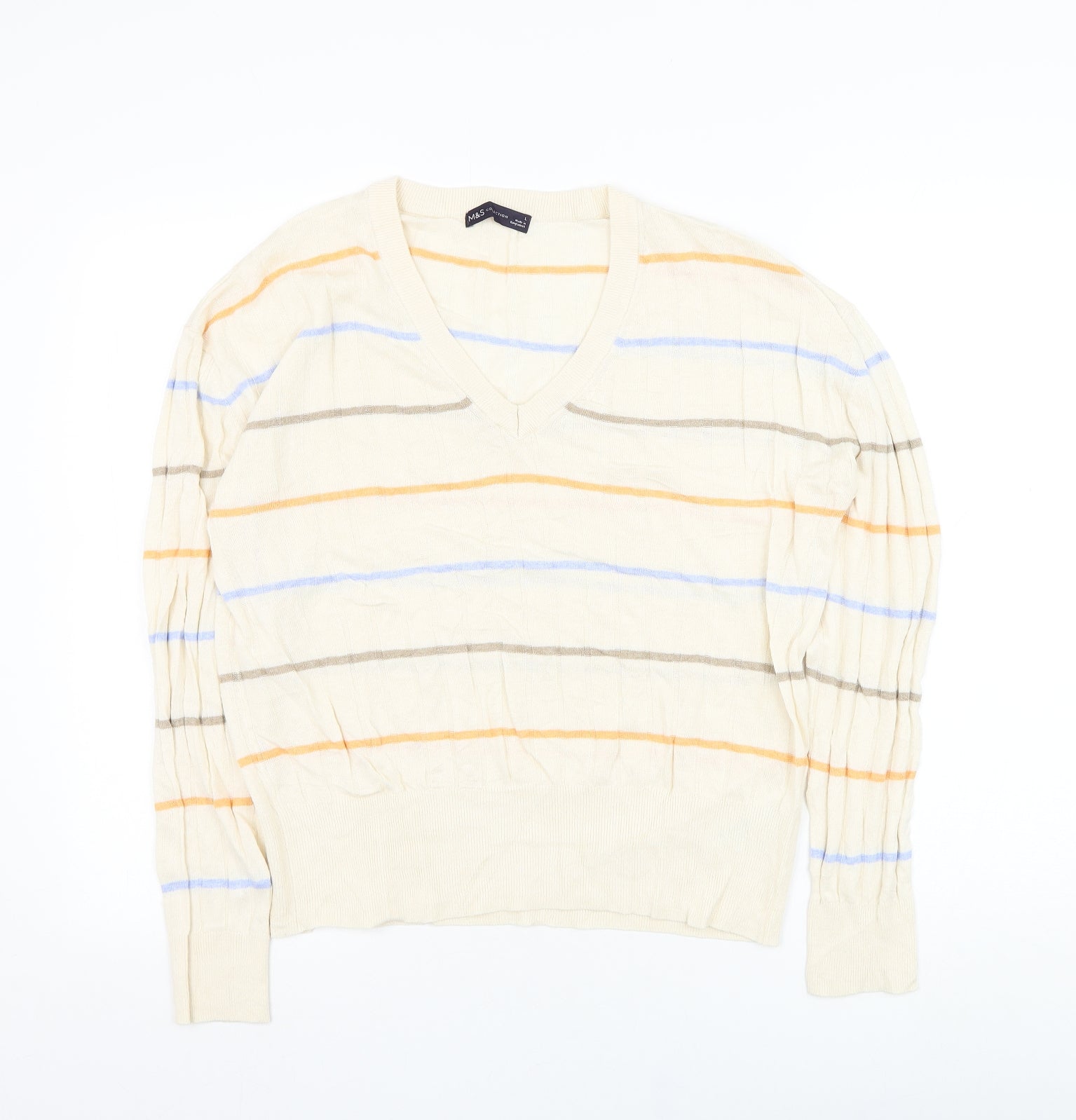 Marks and Spencer Mens Ivory V-Neck Striped Viscose Pullover Jumper Size L