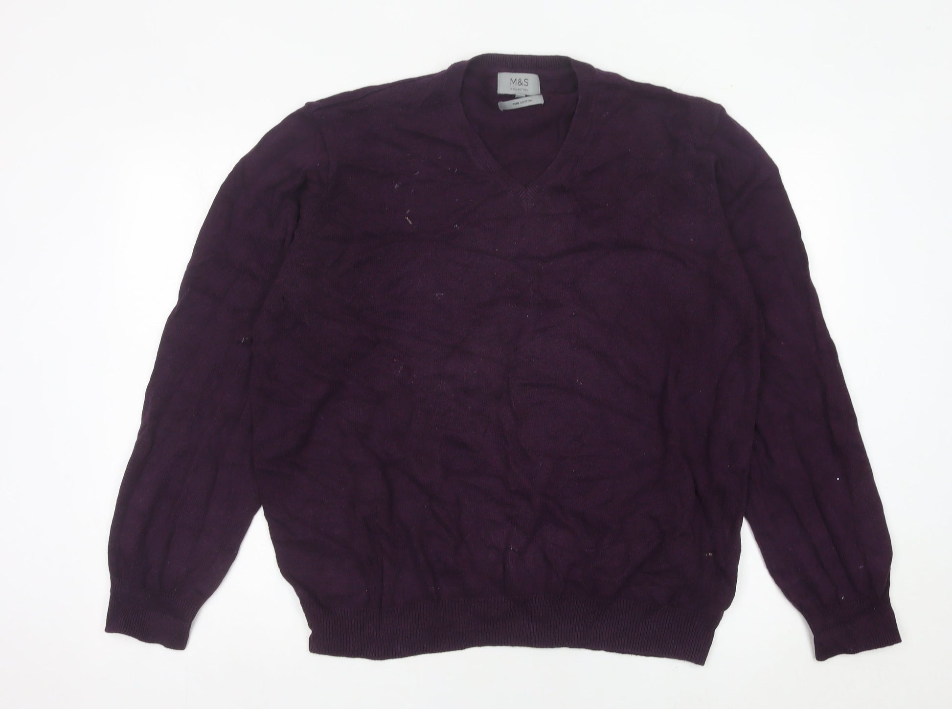 Marks and Spencer Mens Purple 2XL Cotton V-Neck Jumper