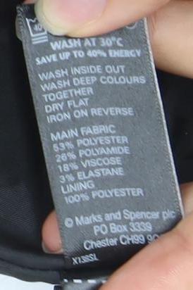 - Material Breakdown: 63% Polyester 34% Viscose 3% Elastane