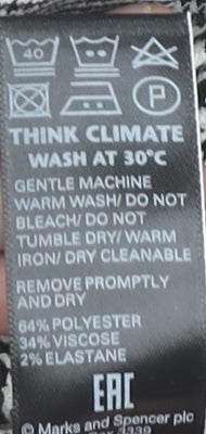 - Material Breakdown: 64% Polyester 34% Viscose 2% Elastane