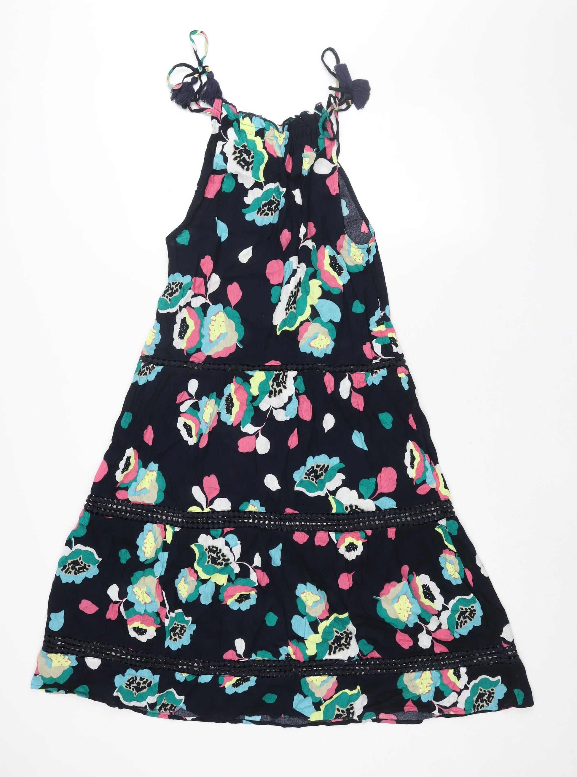 Marks and Spencer Womens Blue Floral Cotton A-Line Size 8 Round Neck Tie - Tassle Strap Lace Detail